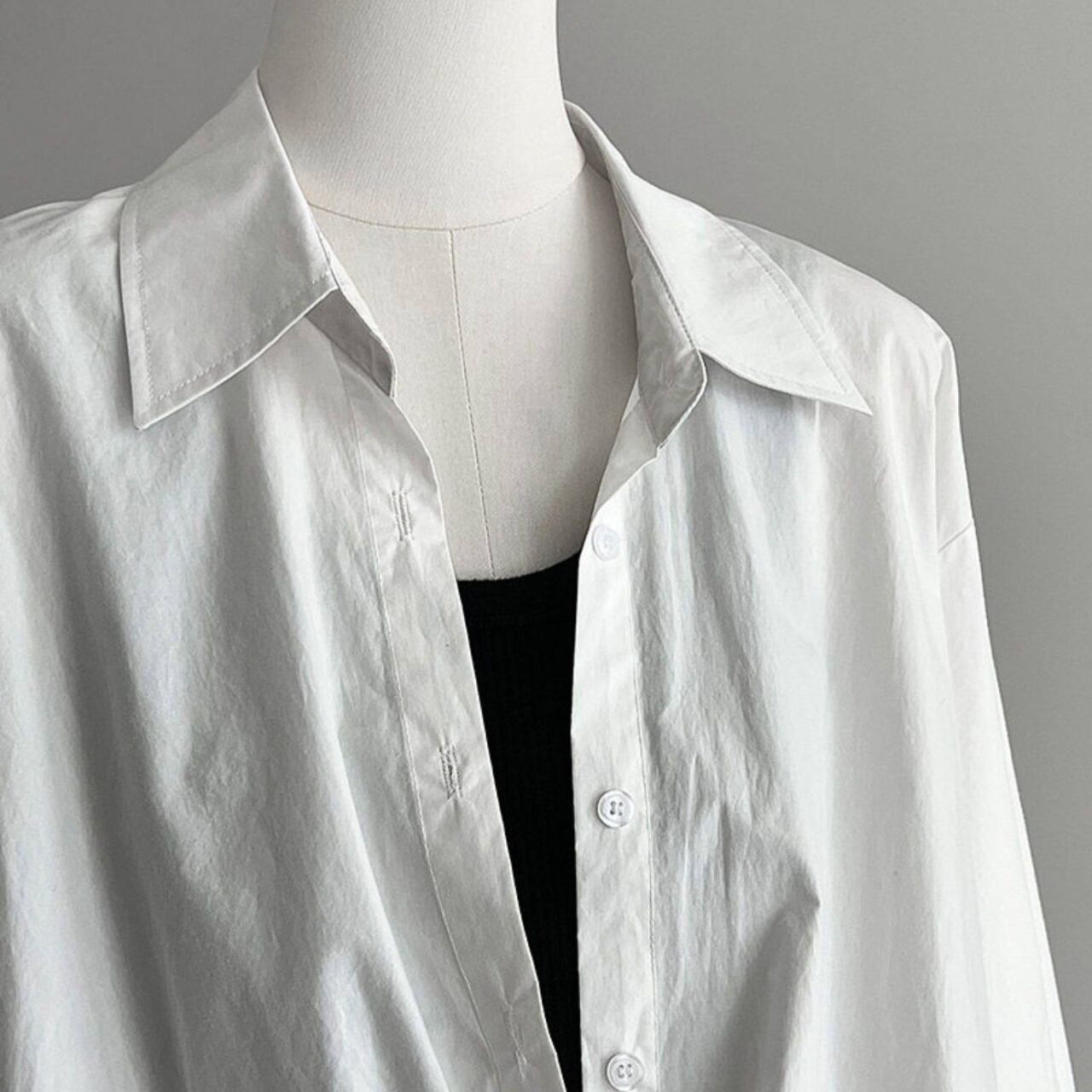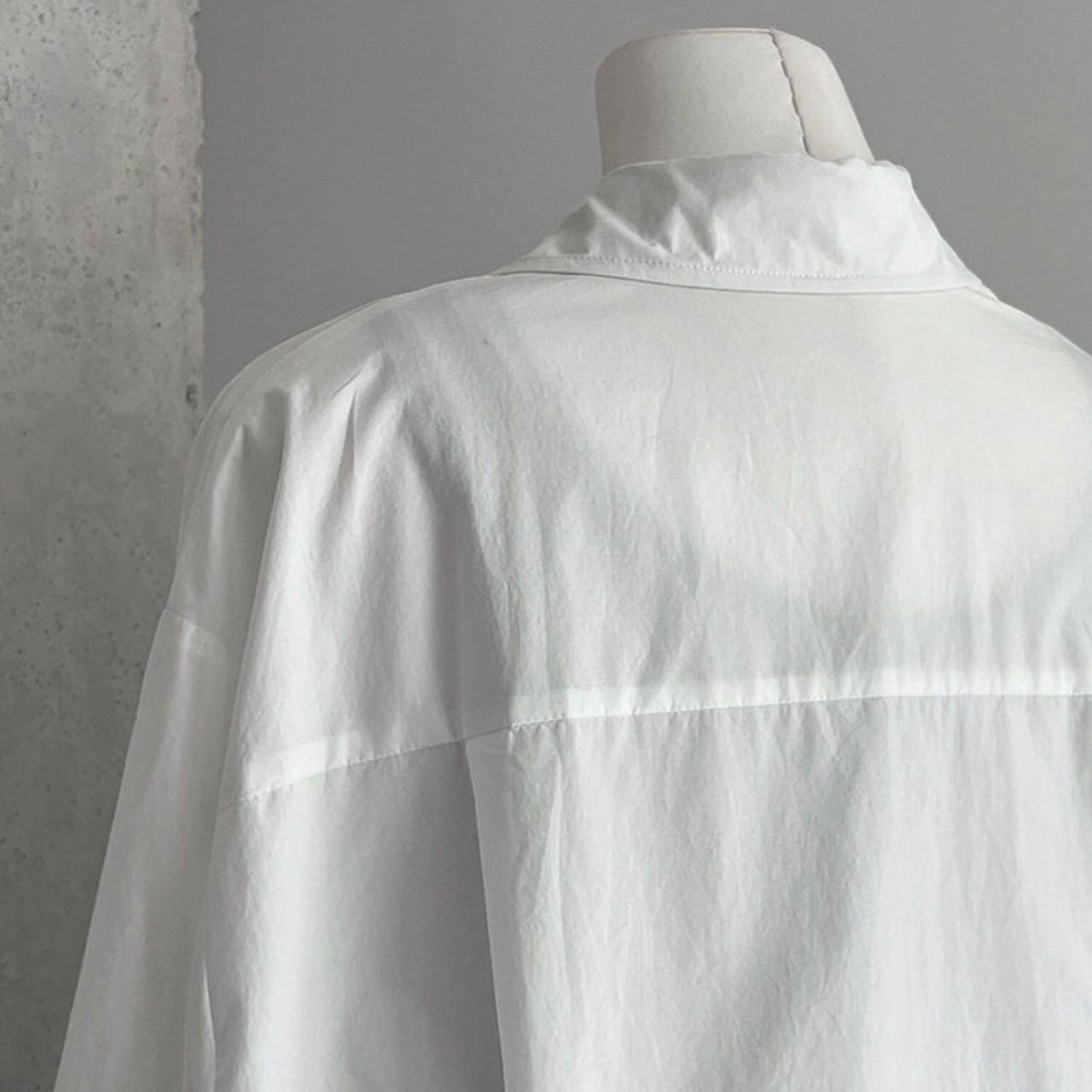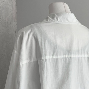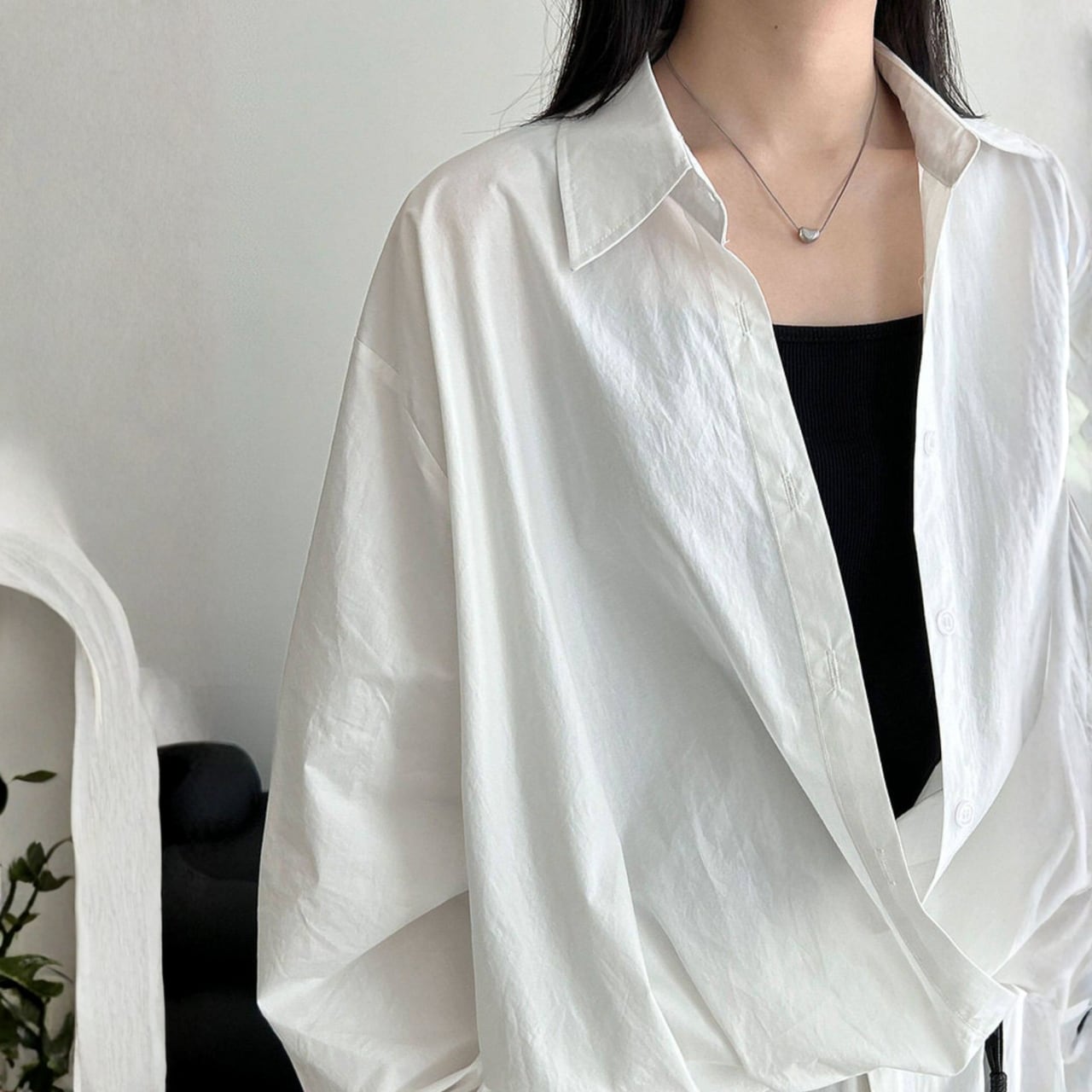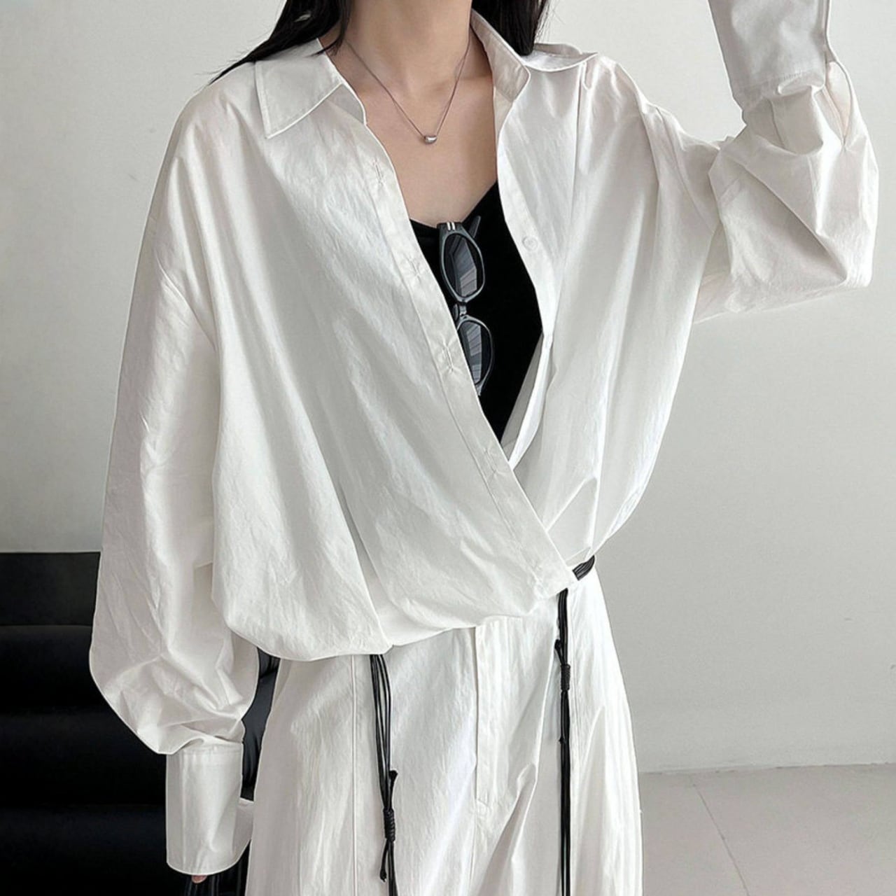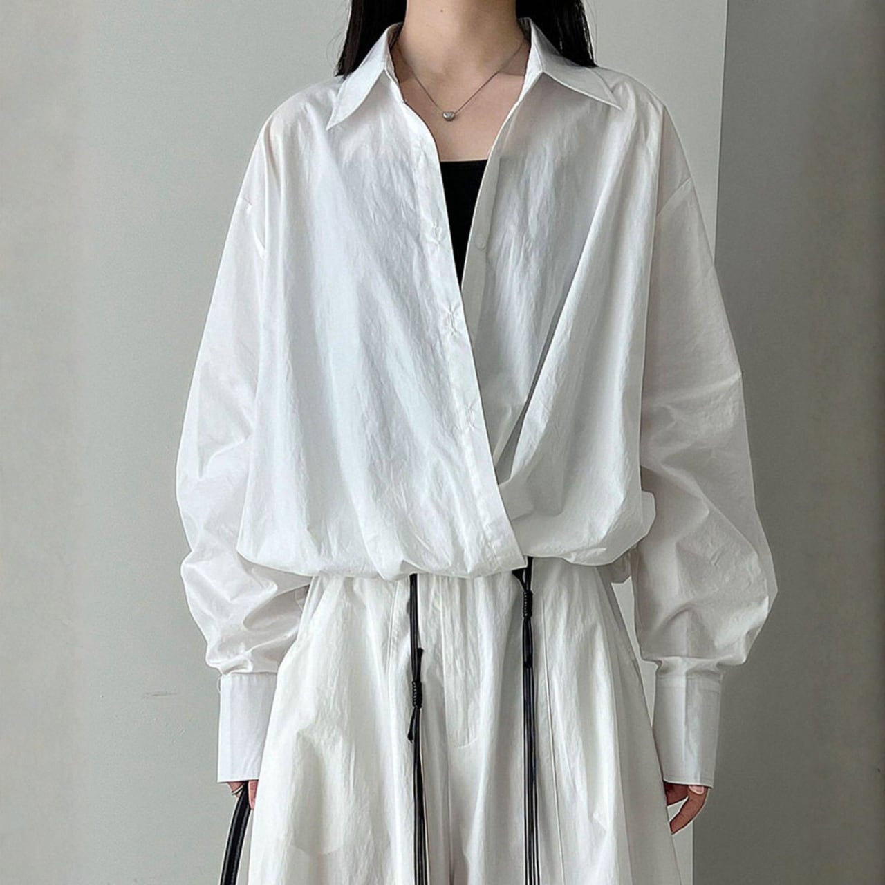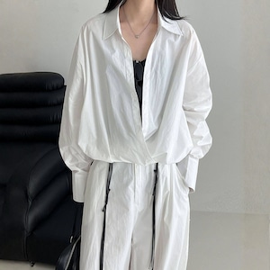 ラップ風デザインが目を引く、ドロップショルダーシャツ。
