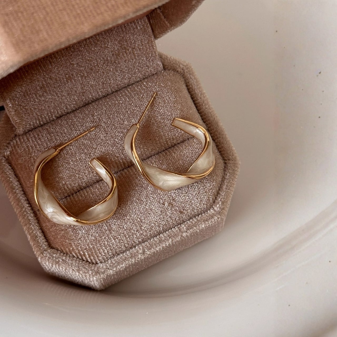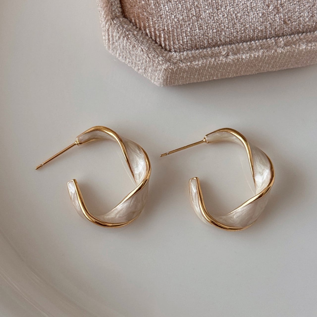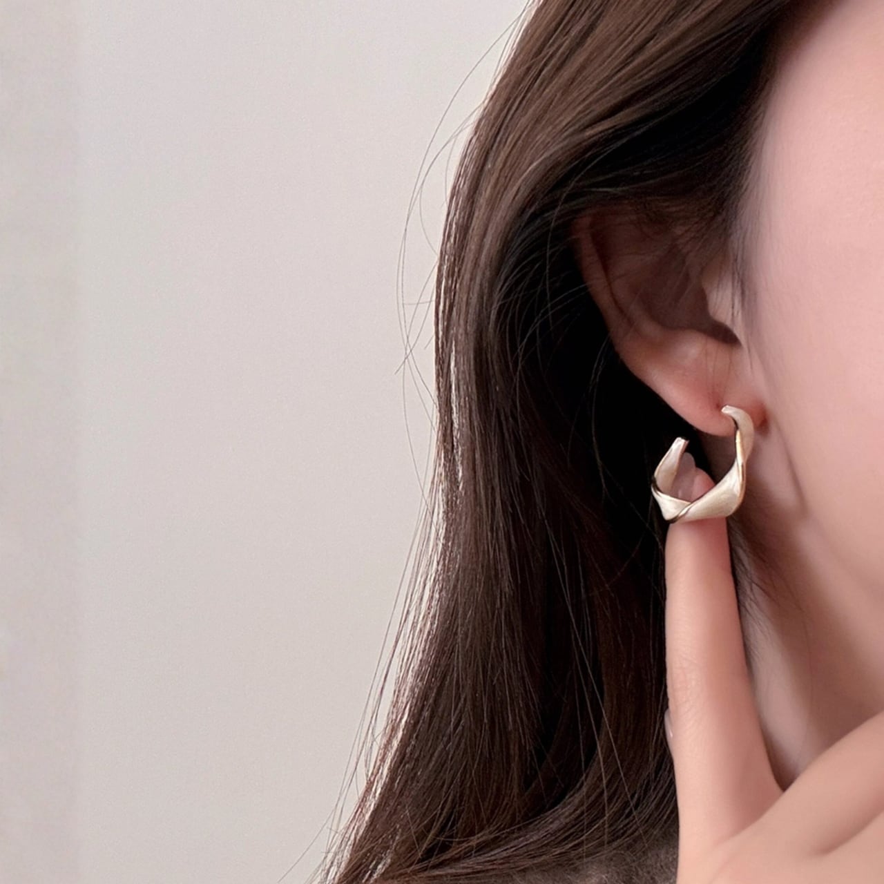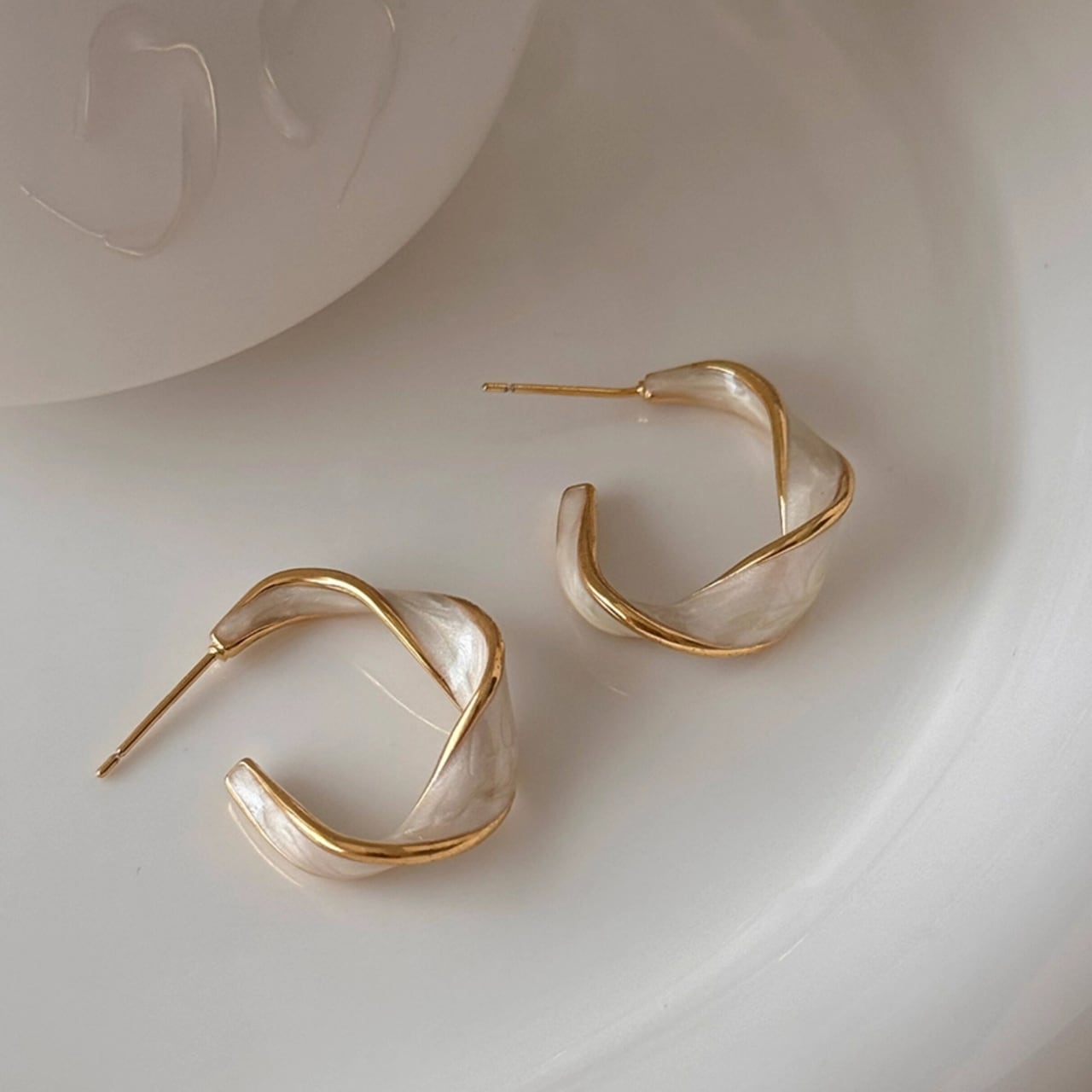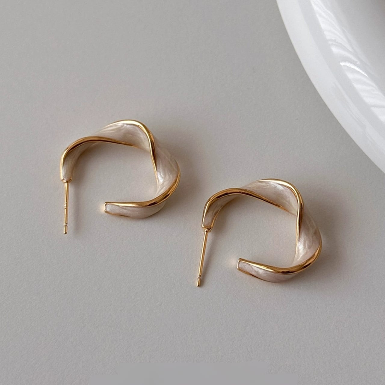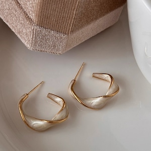 フープのような形状にツイストを加えたデザインが特徴的なピアス。