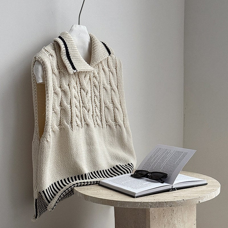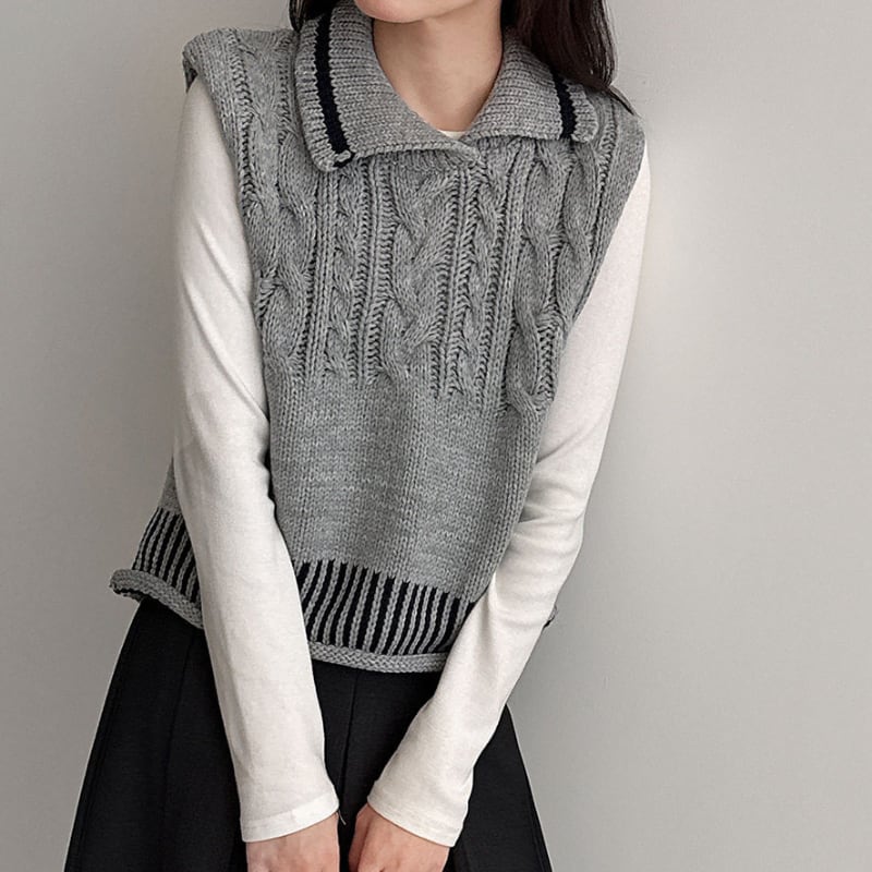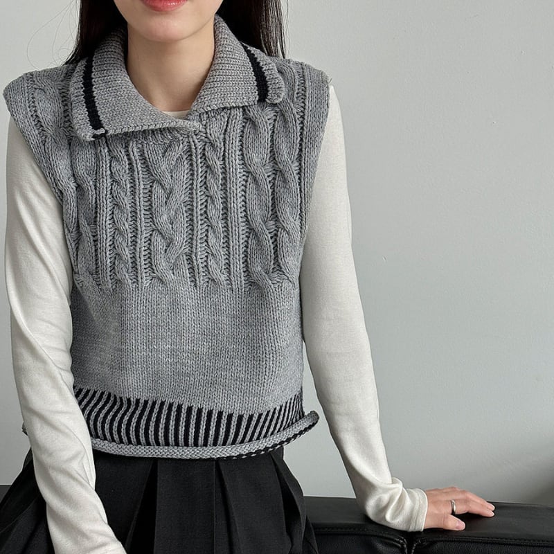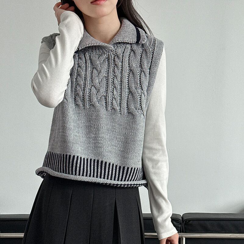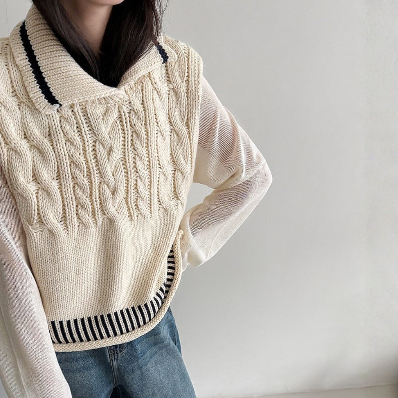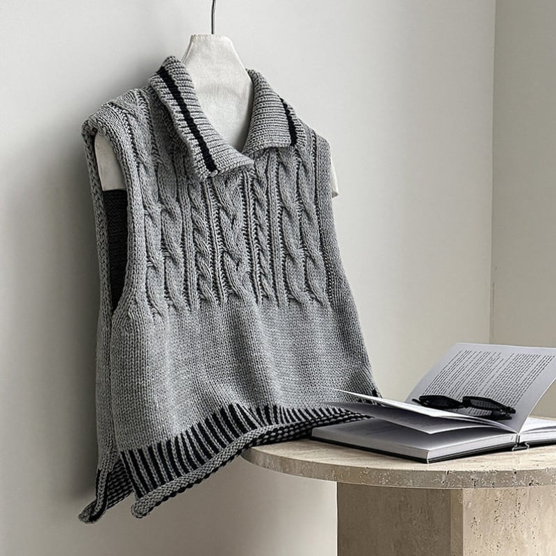 ケーブル編み オープンカラーニットベスト N00299