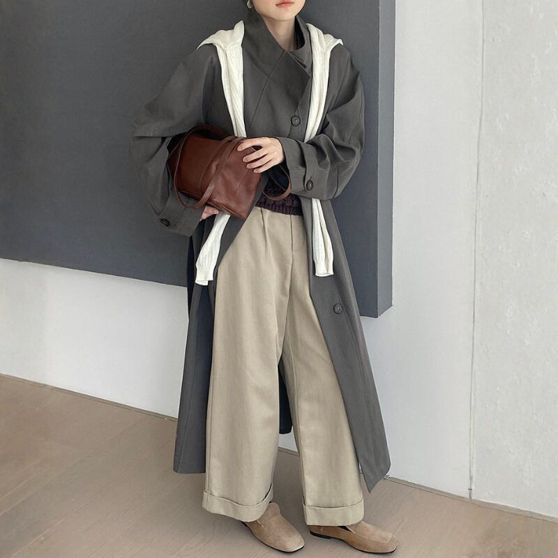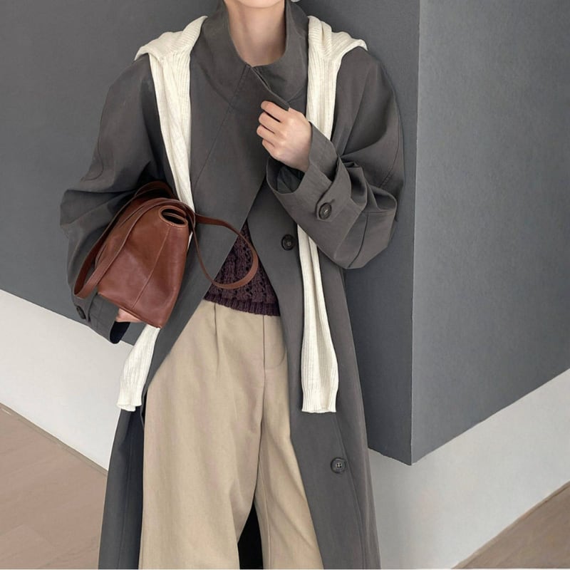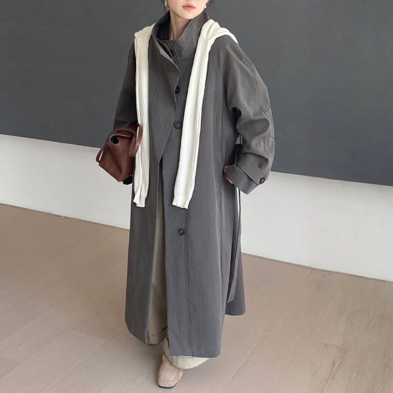カジュアルにもきれいめにも合わせやすい、スタンドカラーのロングコート。