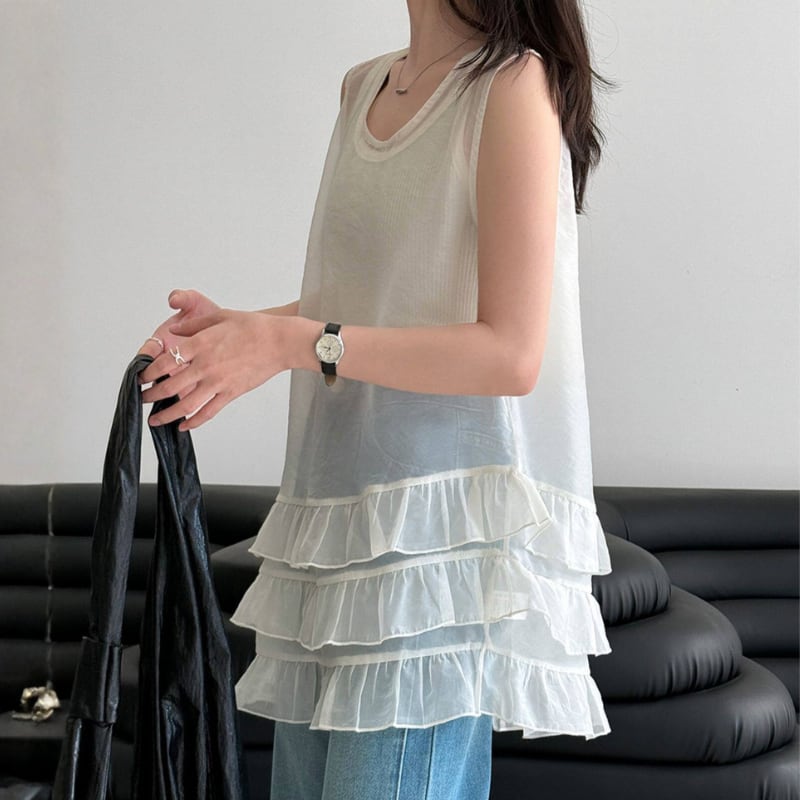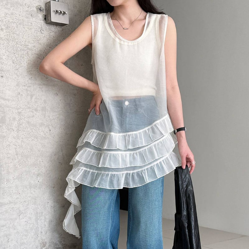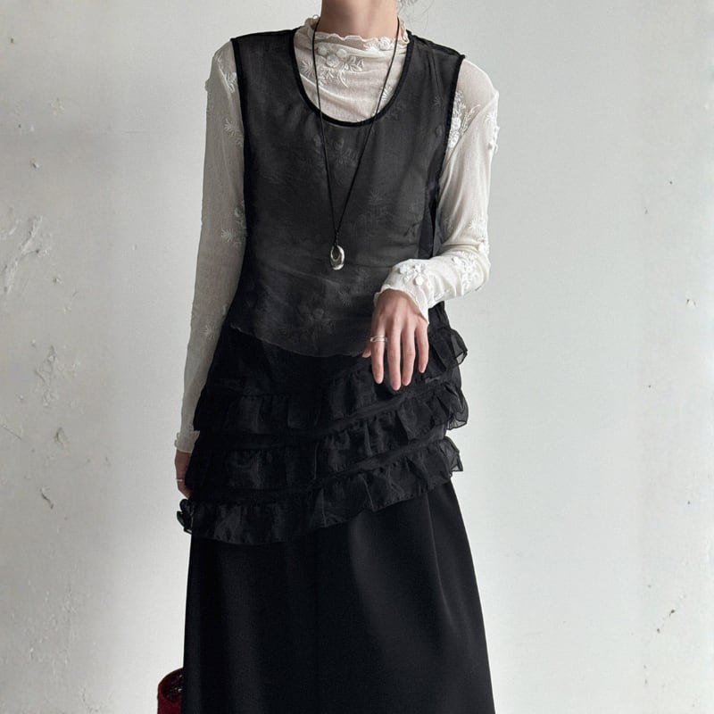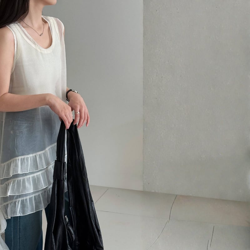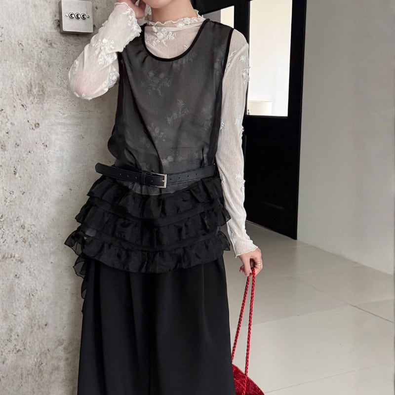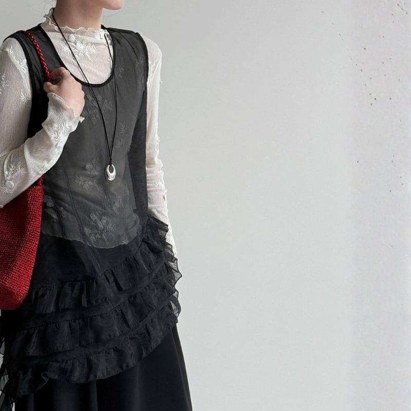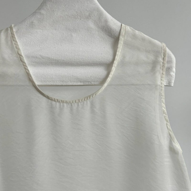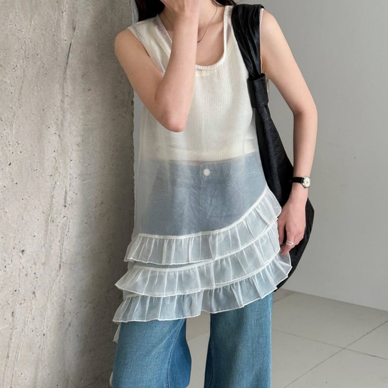 ノースリーブなので、ブラウスやカットソーとのレイヤードスタイルも楽しめます。