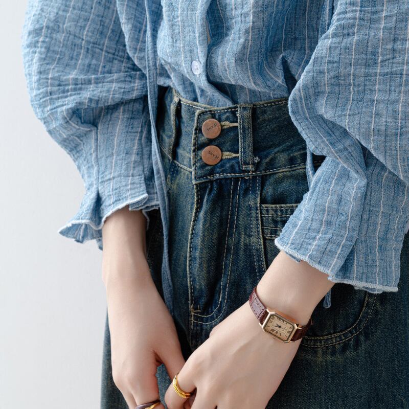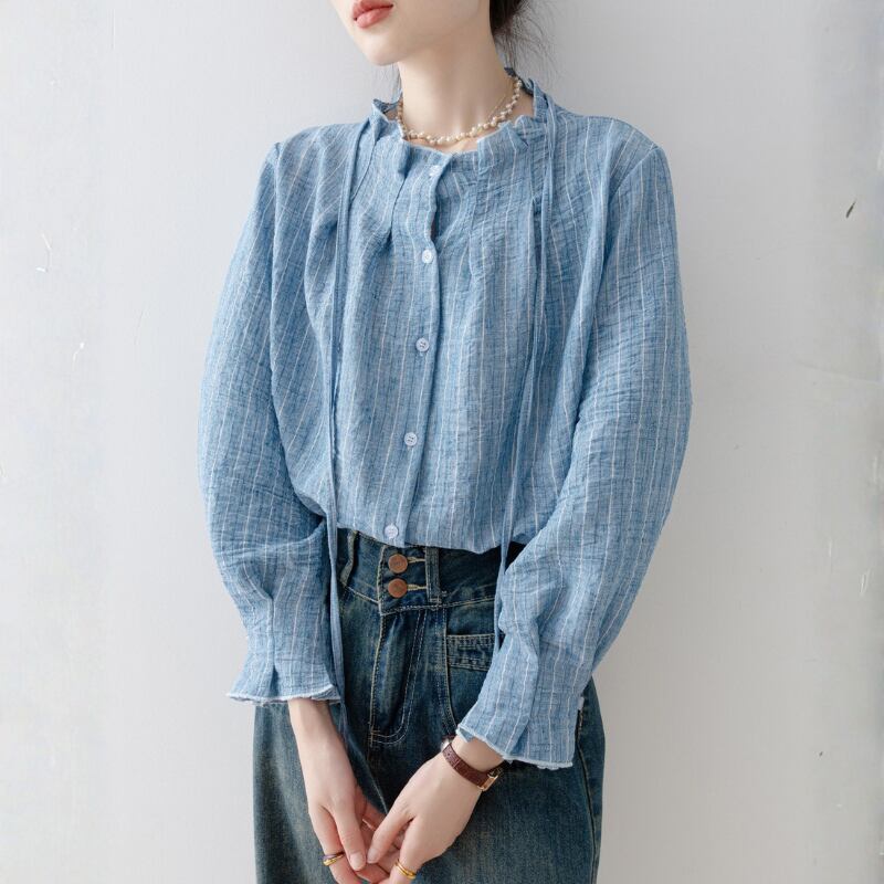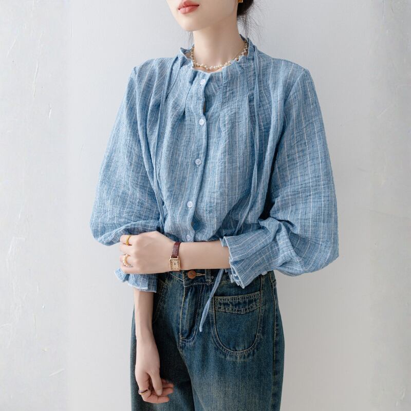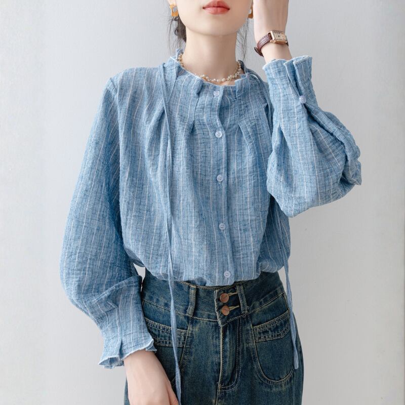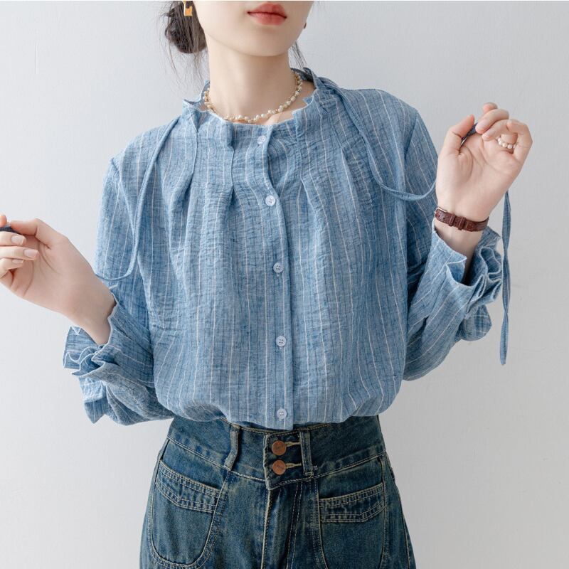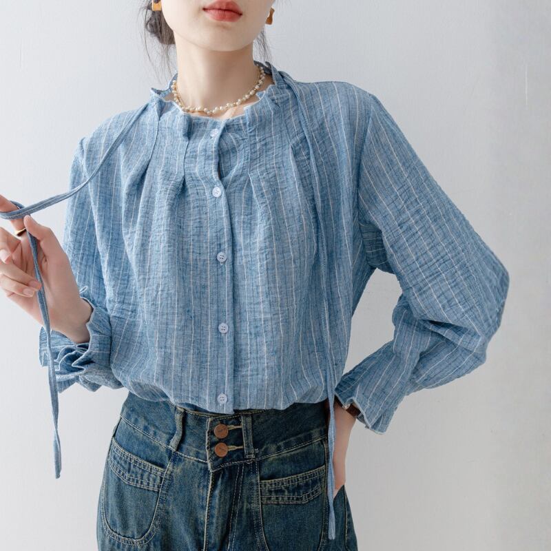 ストライプ柄が印象的なシャツカラーブラウスは、普段使いから少し上品な装いまで対応できます。