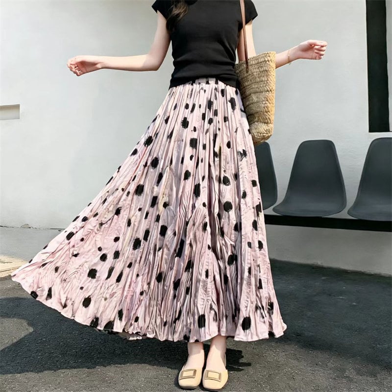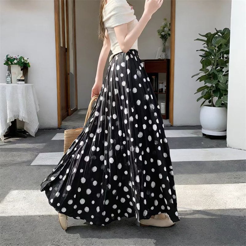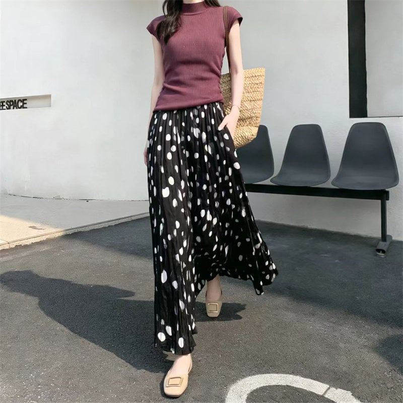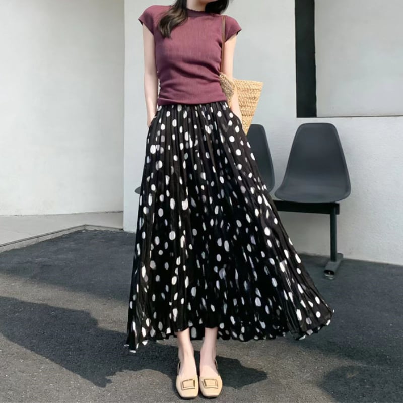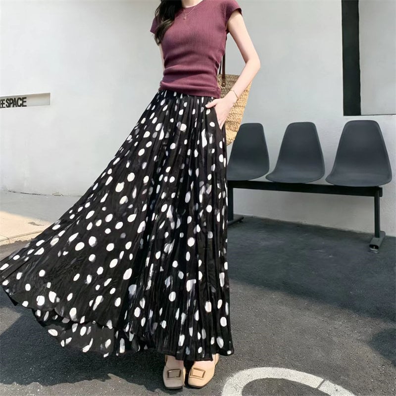 ドット柄が目を引くプリーツスカートは、着こなしの主役になること間違いなし。