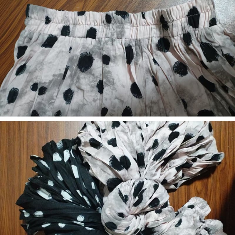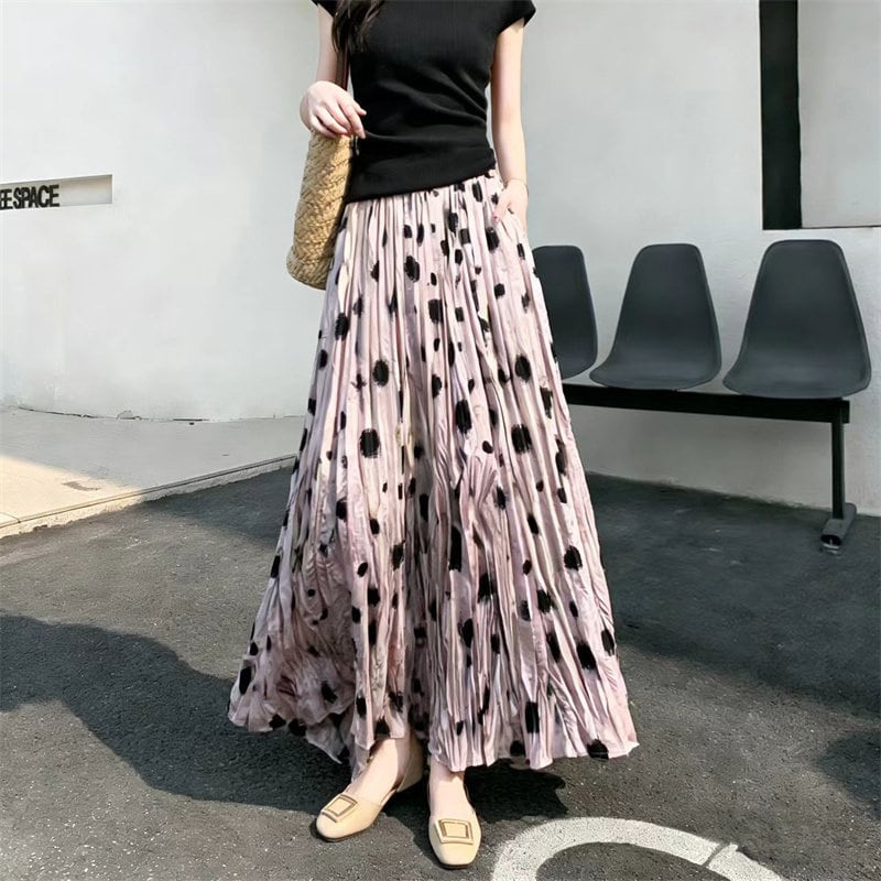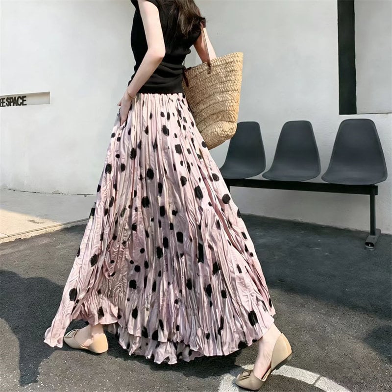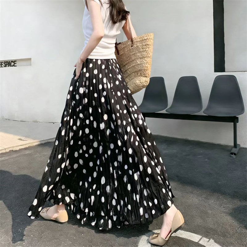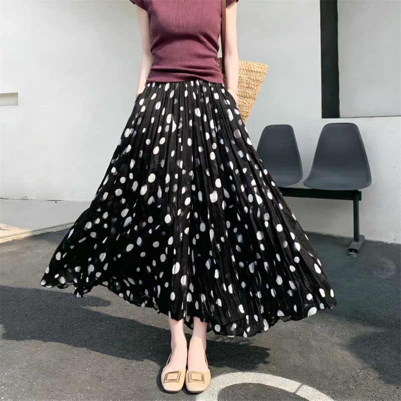 ドット柄が目を引くプリーツスカートは、着こなしの主役になること間違いなし。