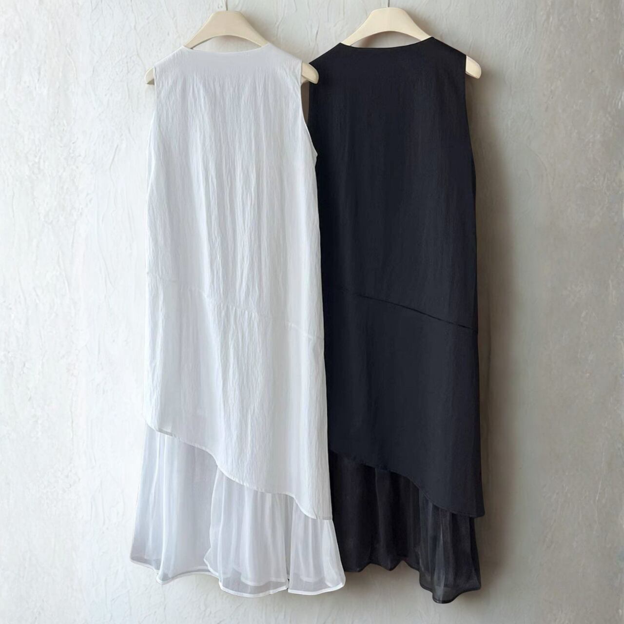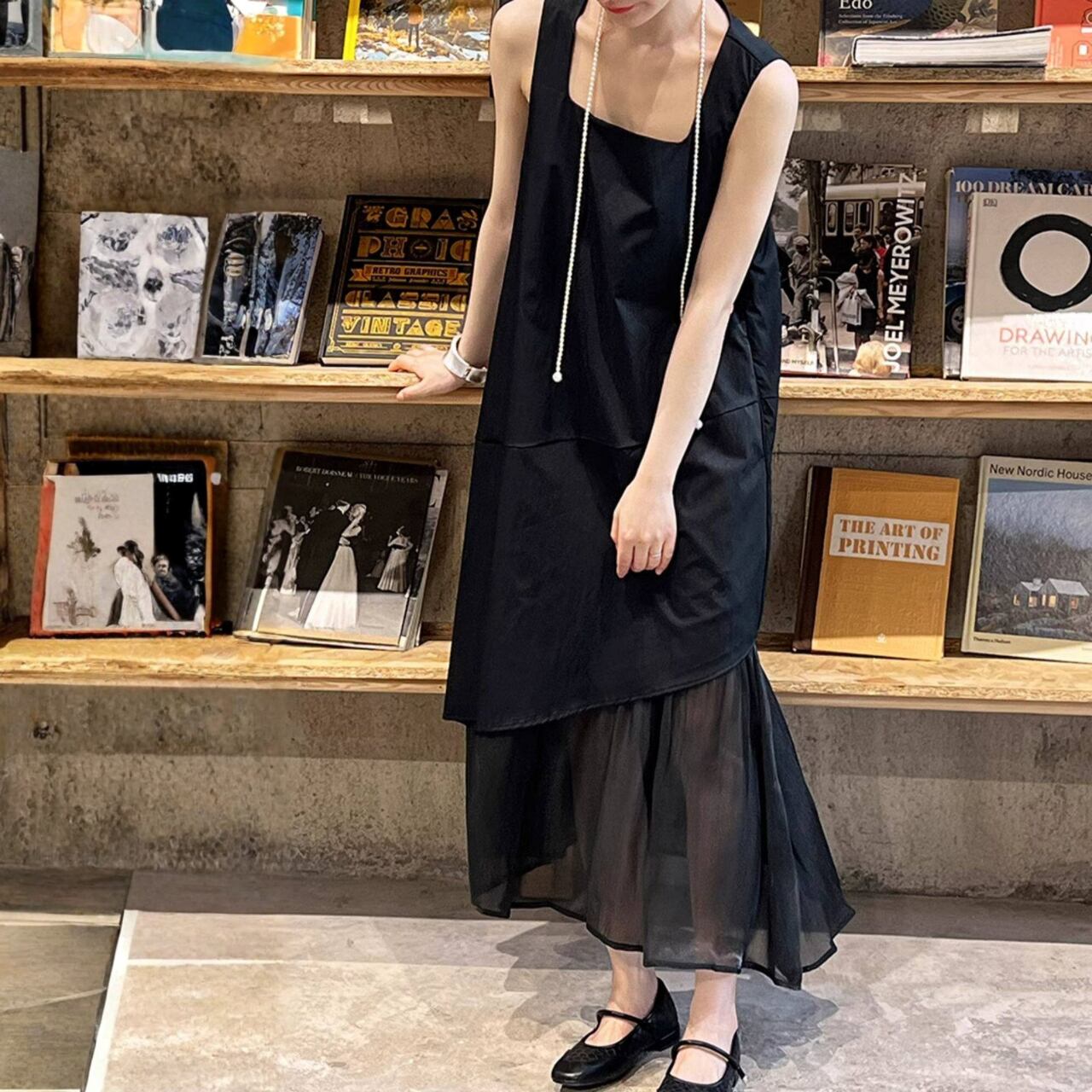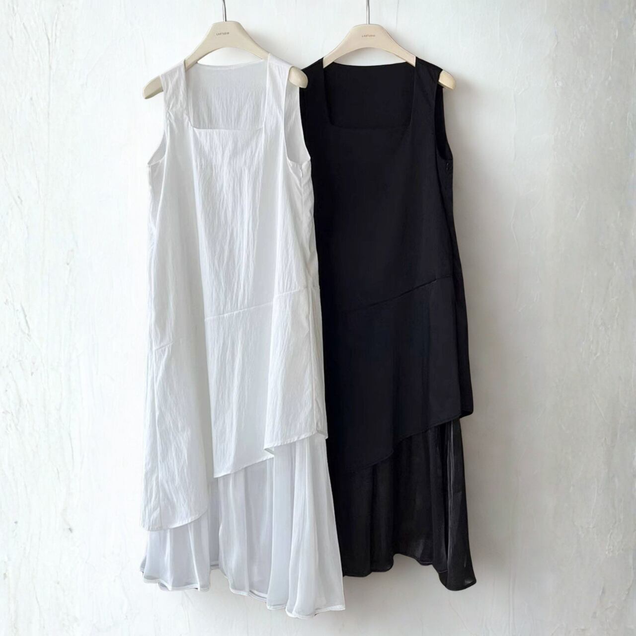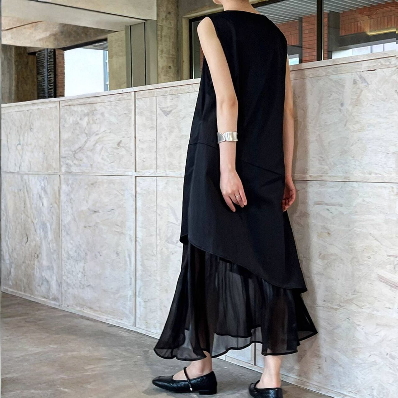 すっきりとしたノースリーブデザインと、アシンメトリーな裾の組み合わせが魅力のワンピース。