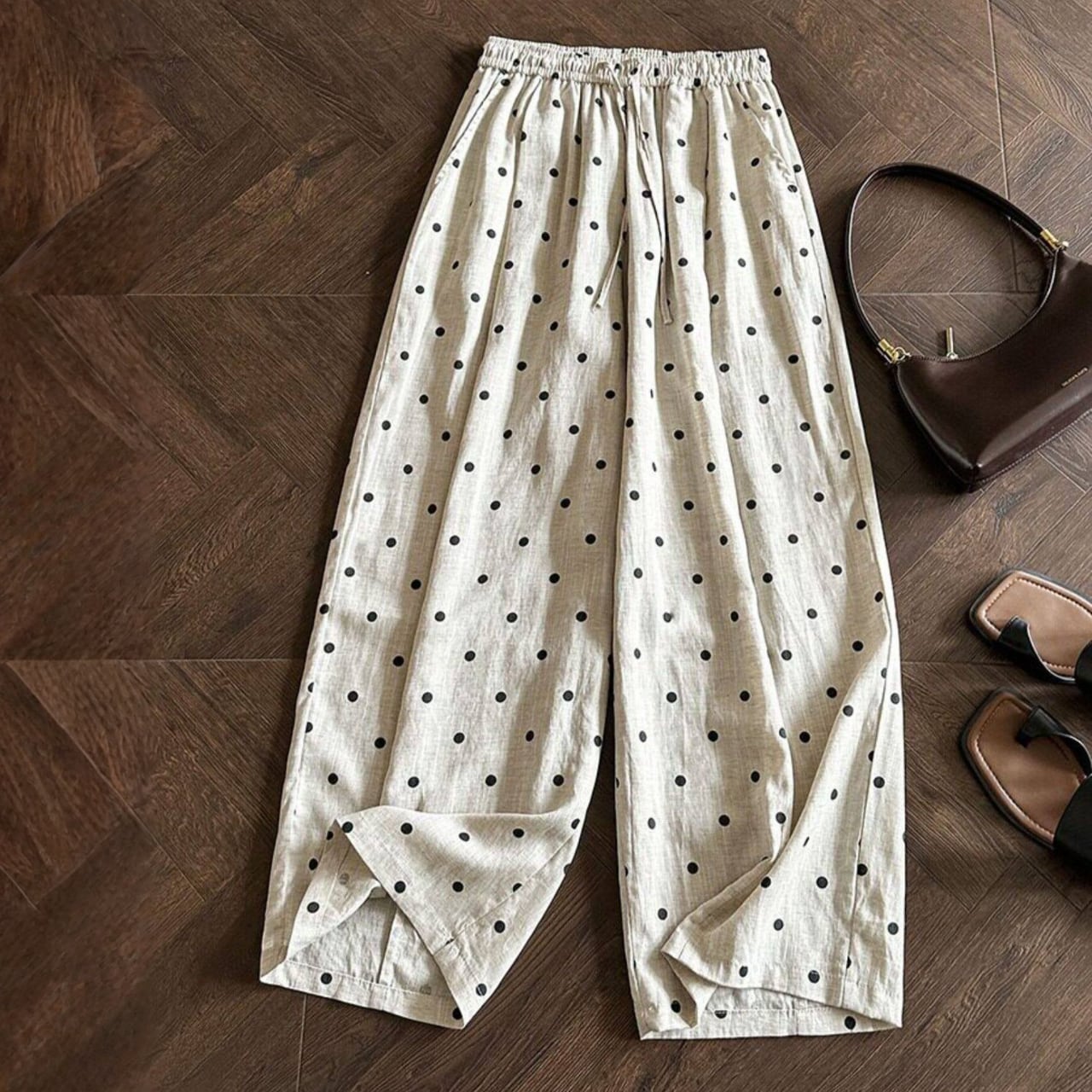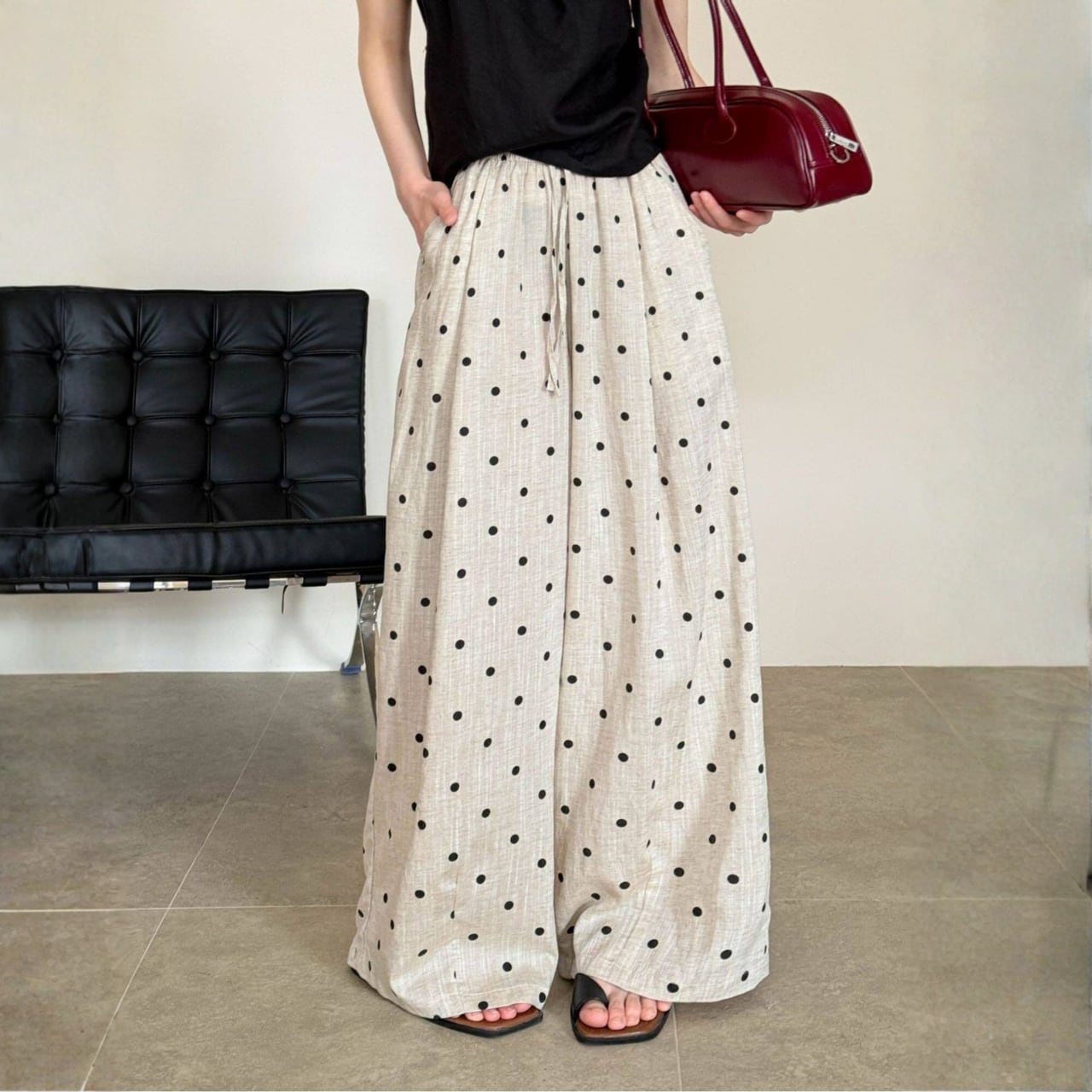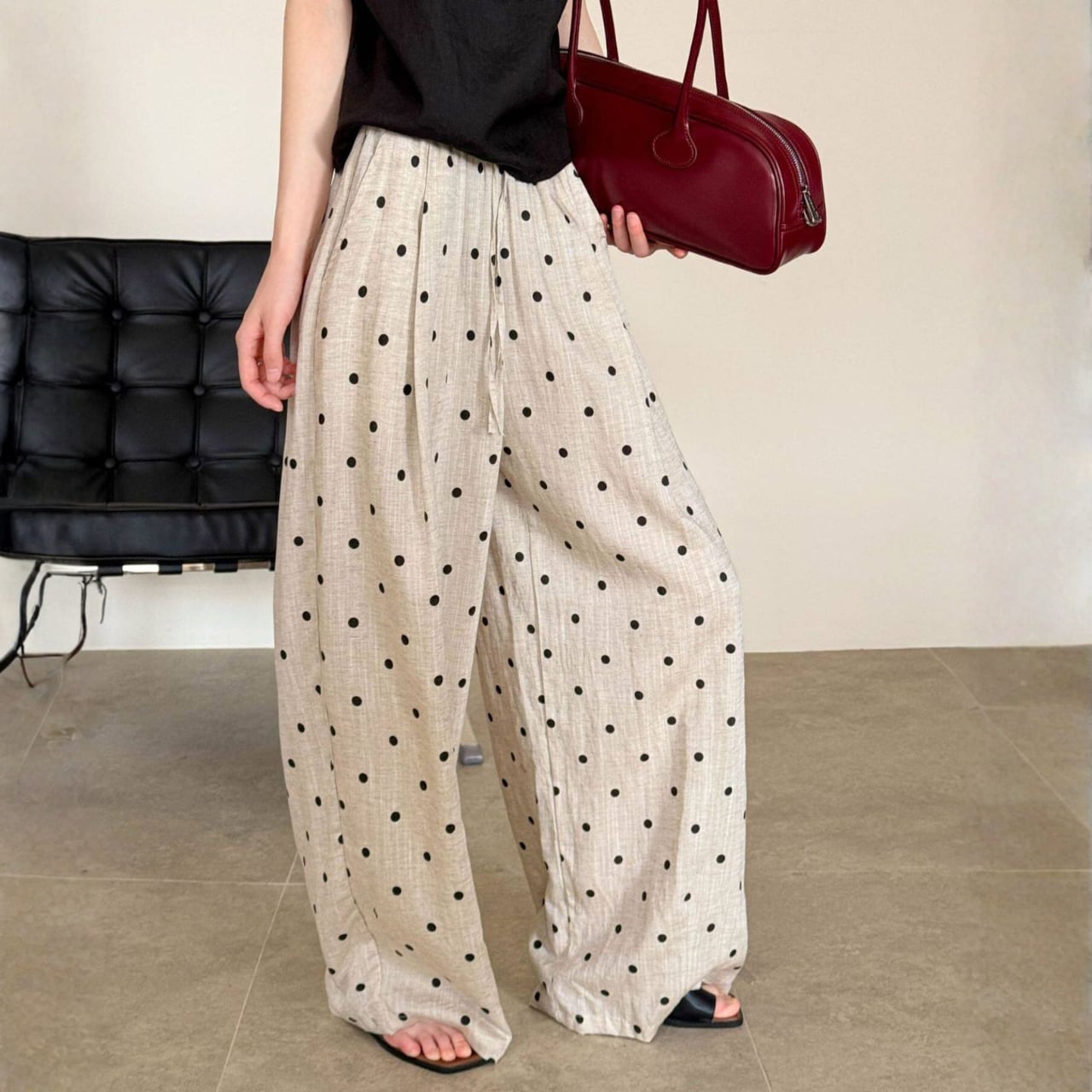 ドローストリングでウエスト調節が可能なドットワイドレッグパンツ。