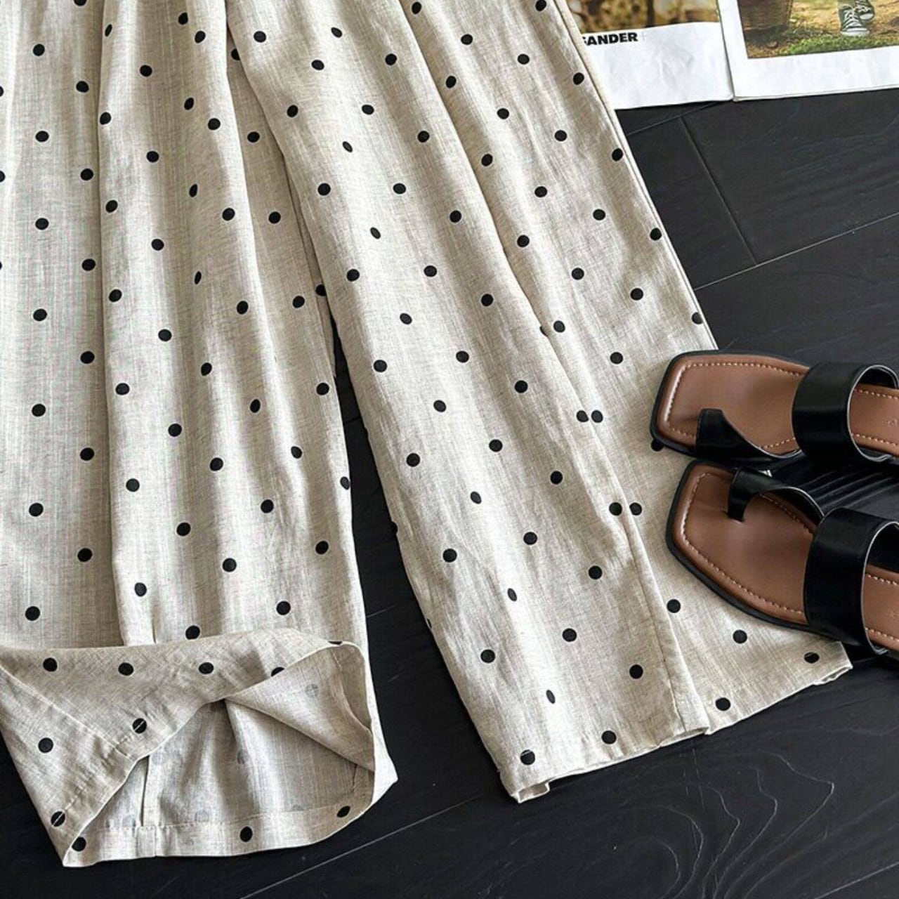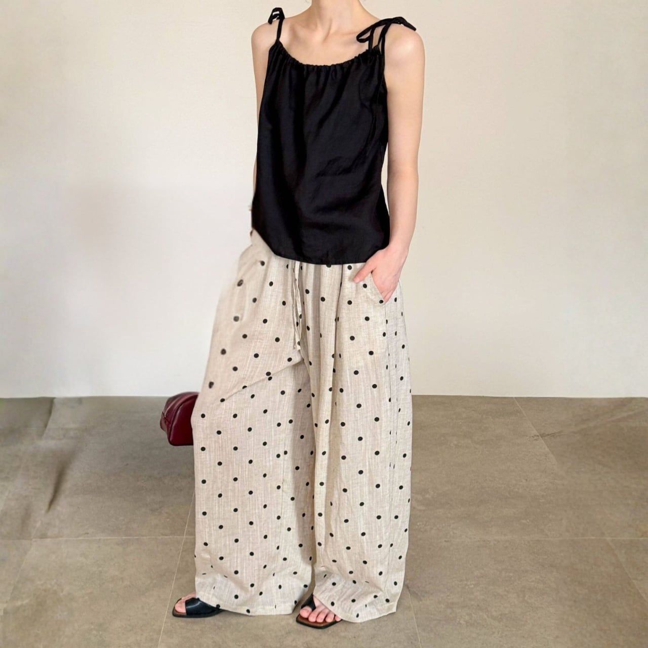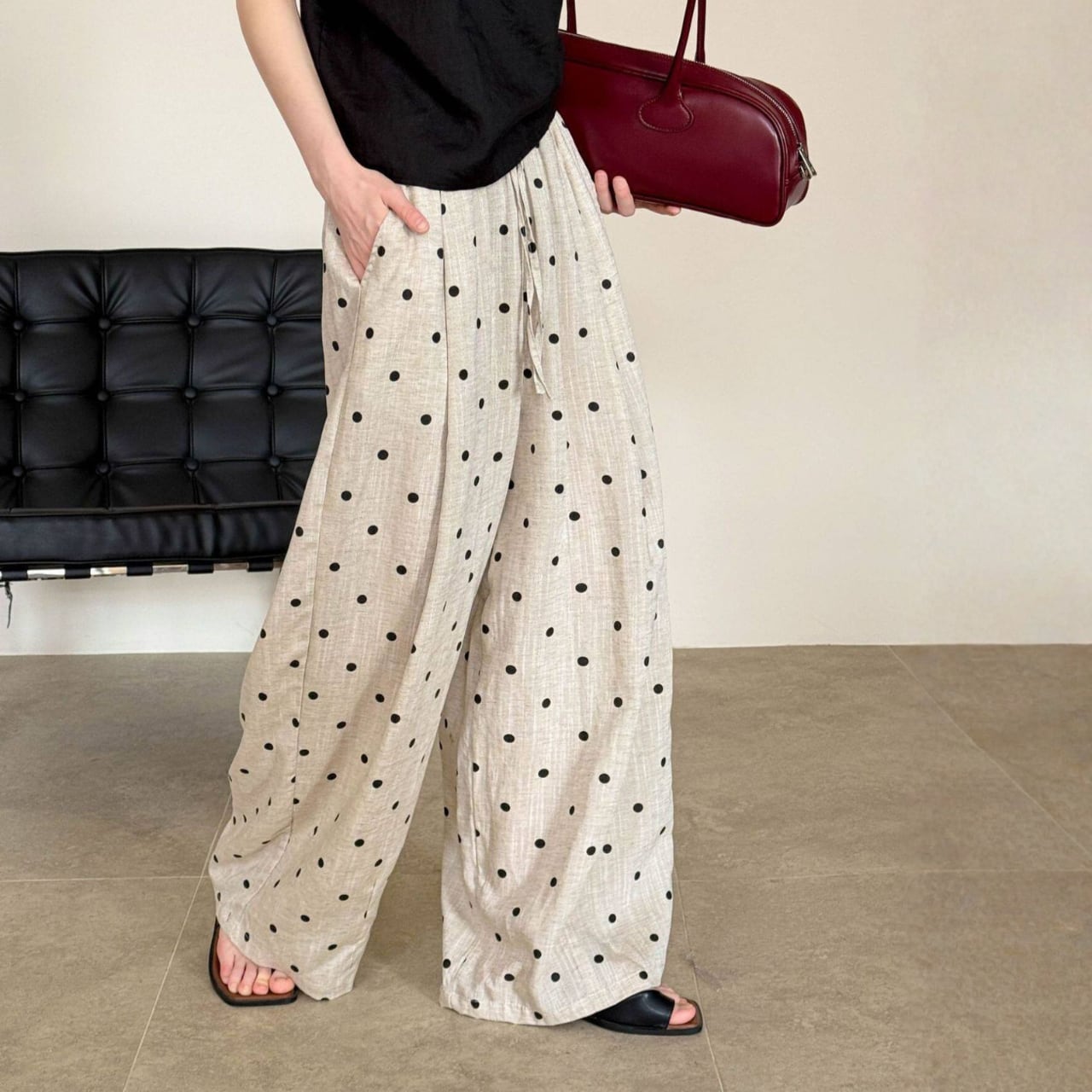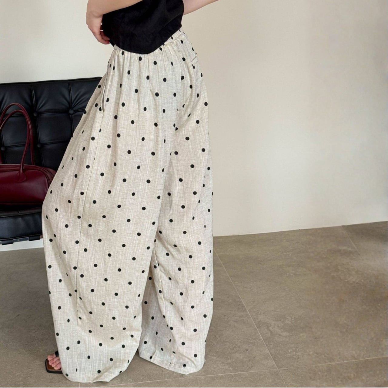 ドローストリングでウエスト調節が可能なドットワイドレッグパンツ。
