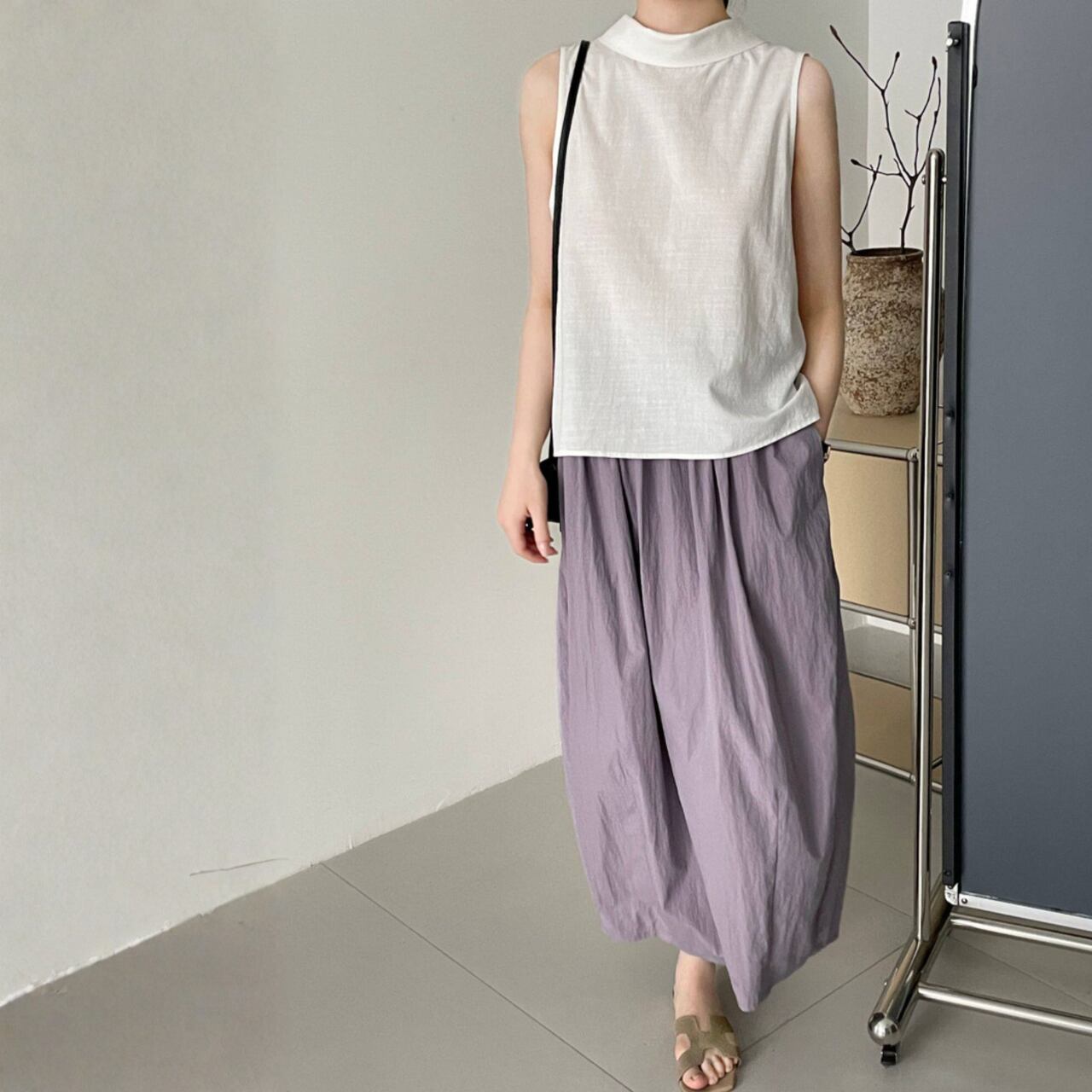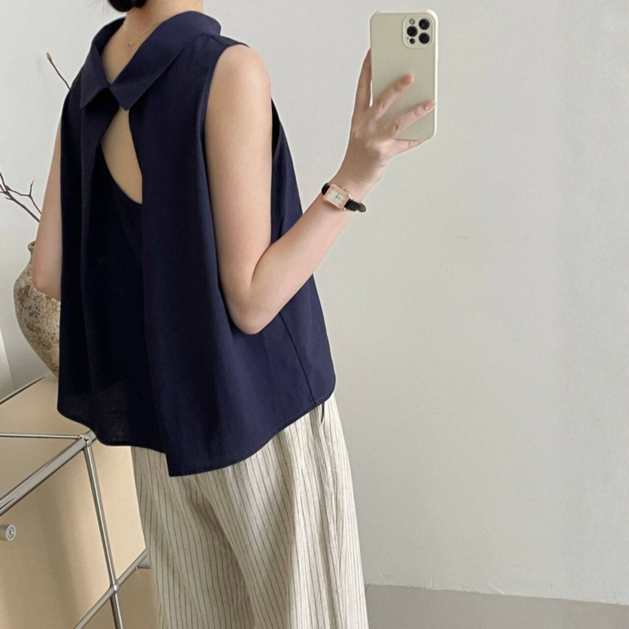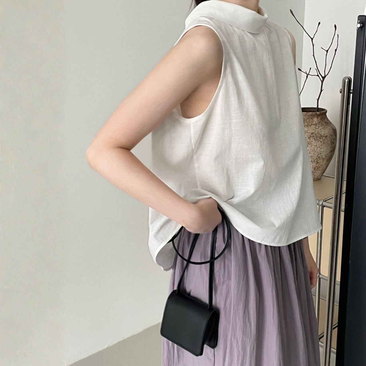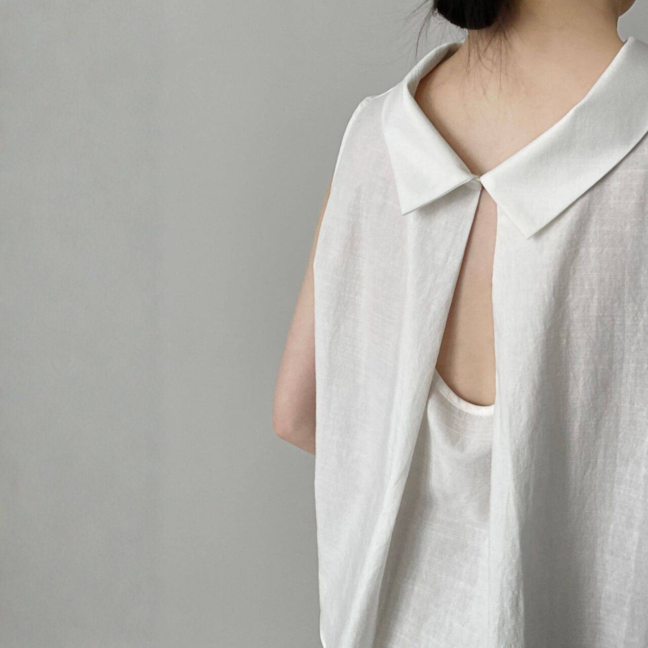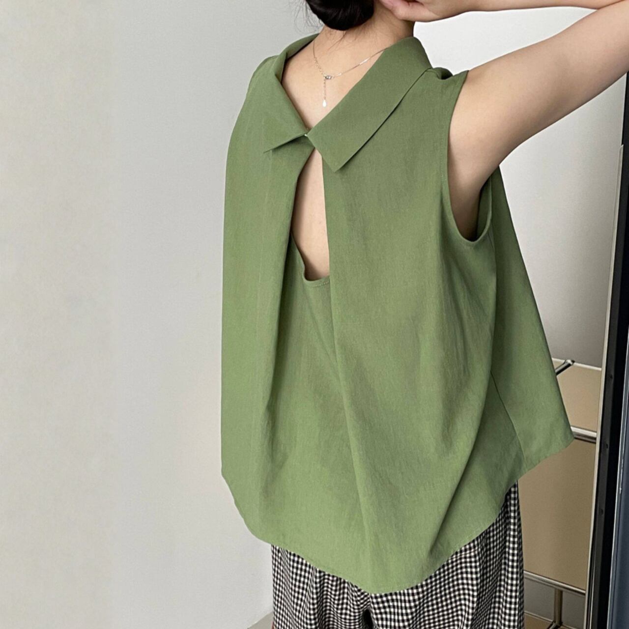 シャツカラー バックオープン ノースリーブブラウス N00379