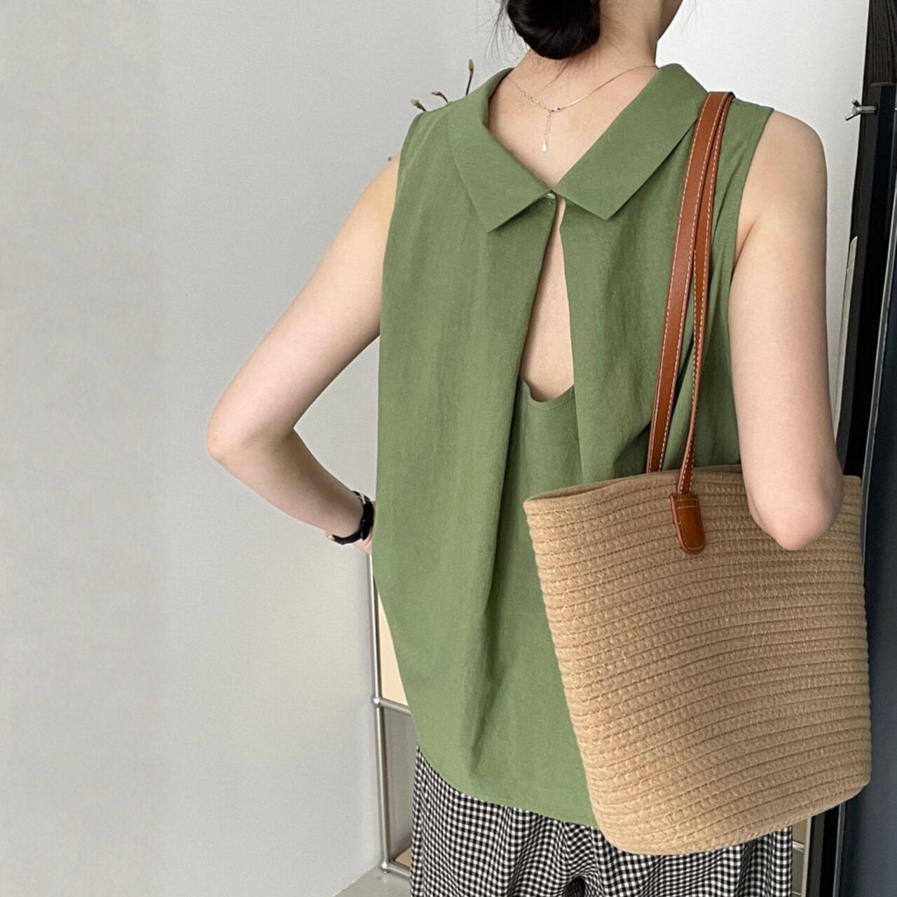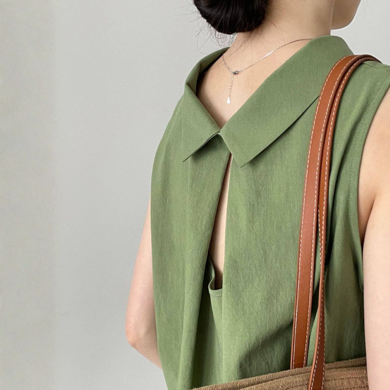 背中の大胆なカットアウトが、クラシックなシャツカラーと組み合わさり、洗練された印象を演出します。