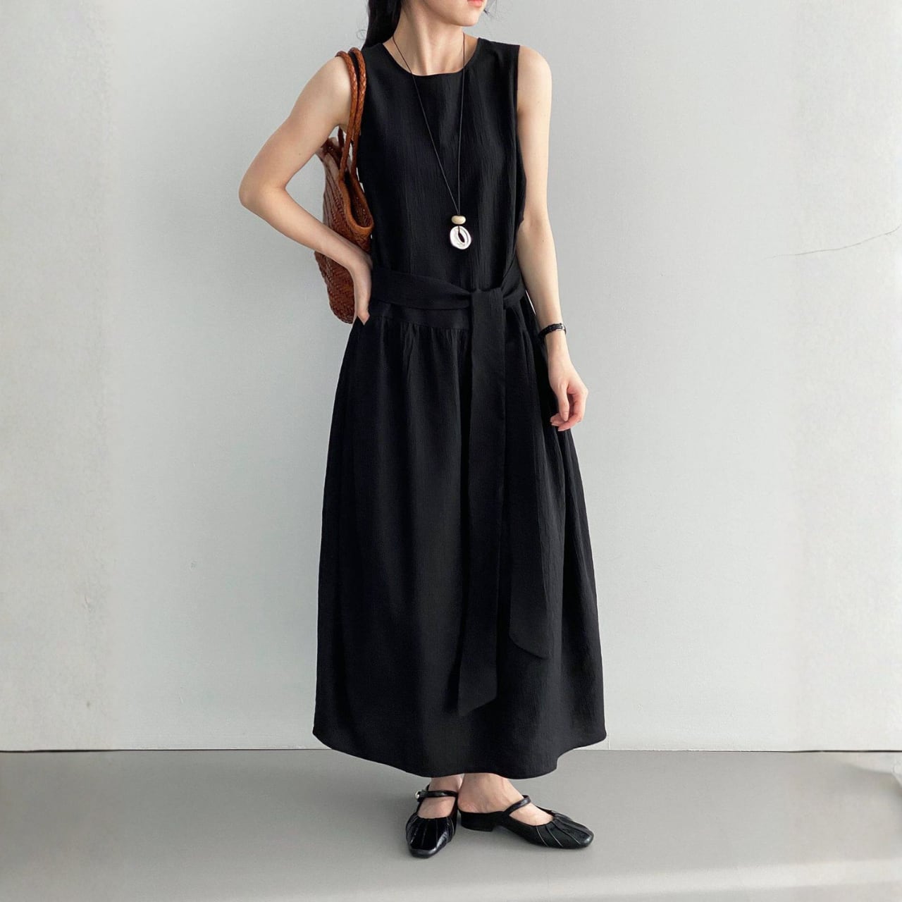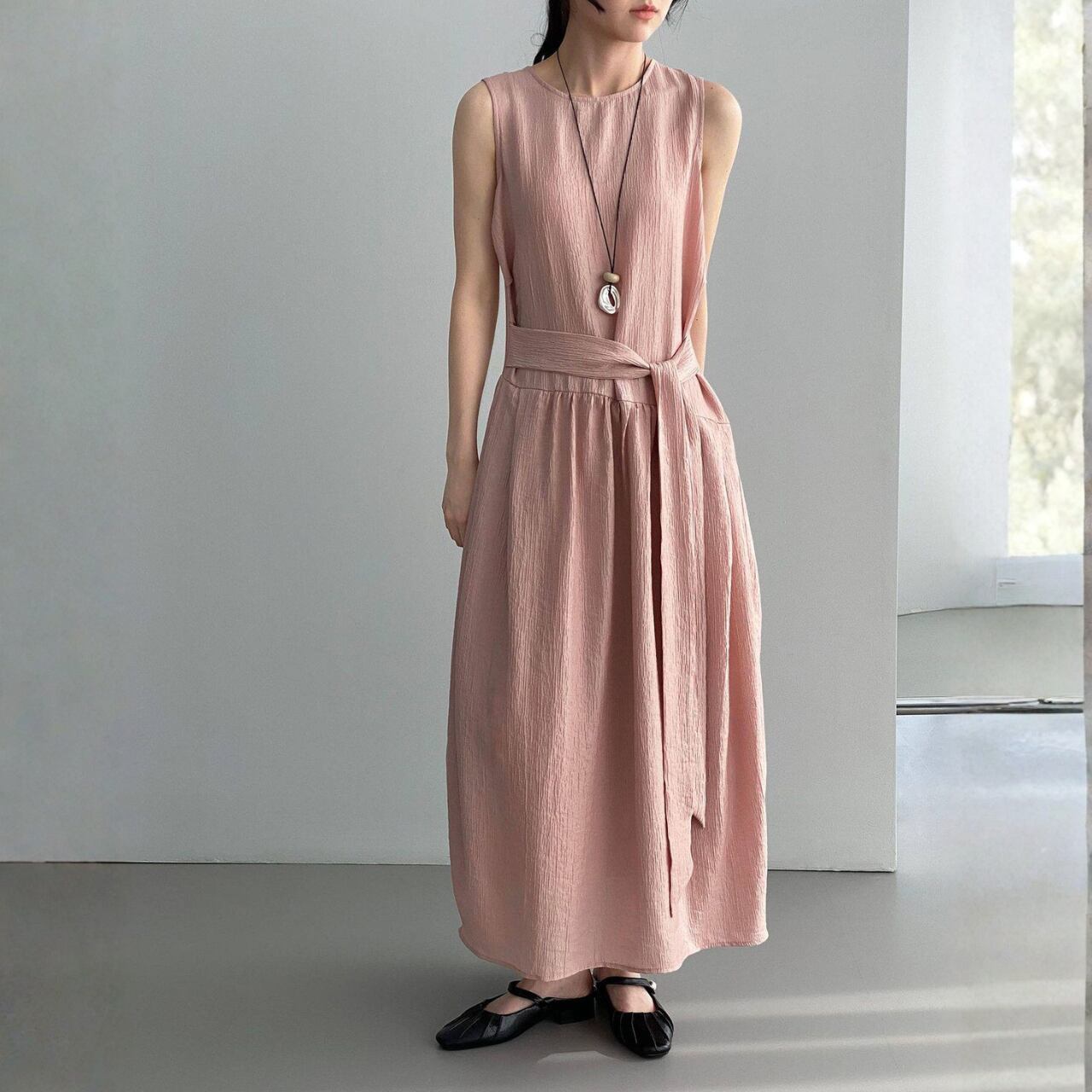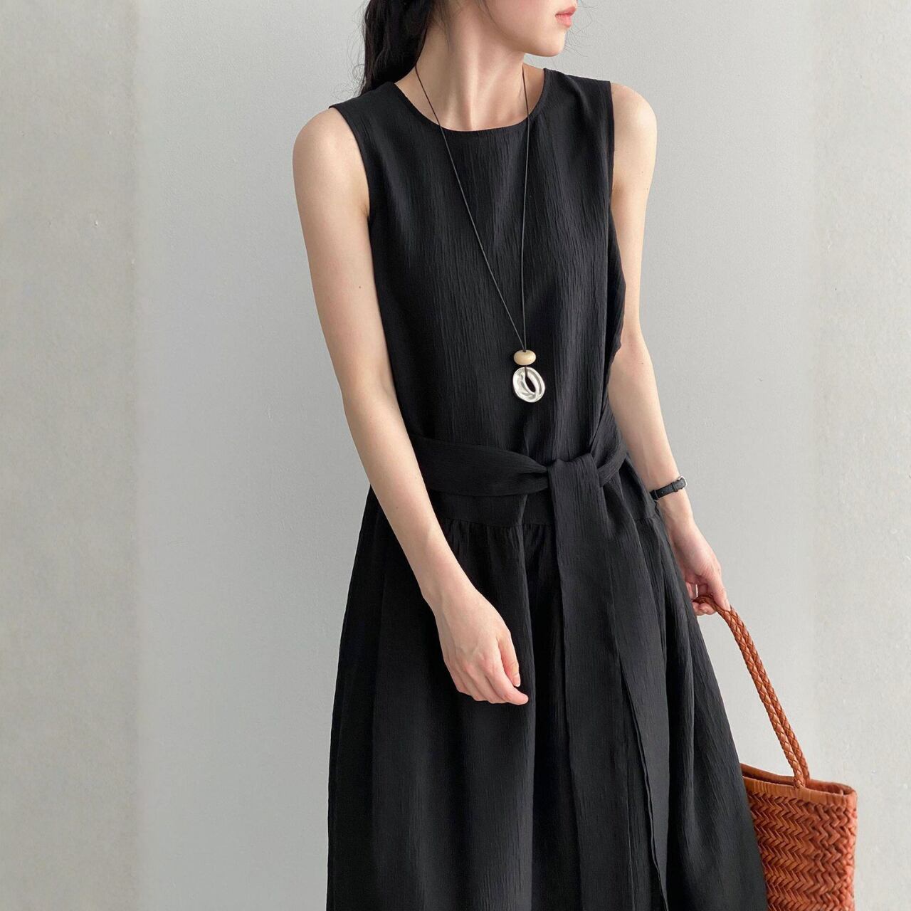 一枚で着映えする、ベルト付きのノースリーブワンピース。