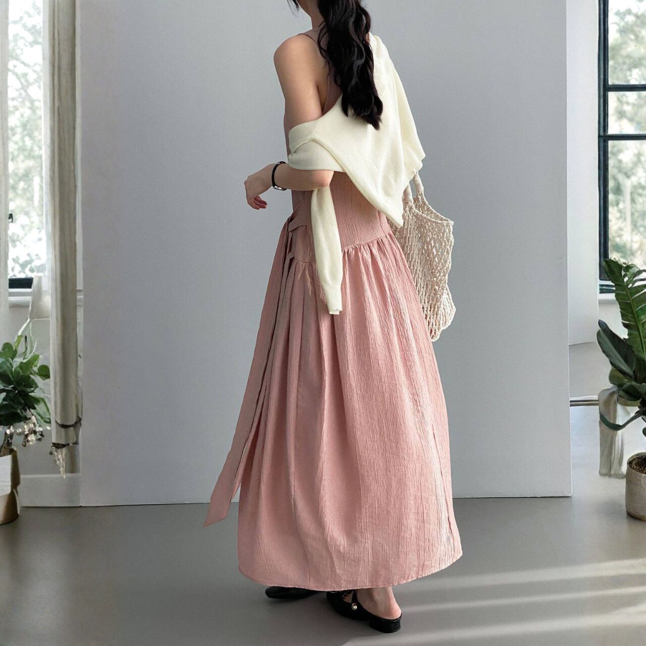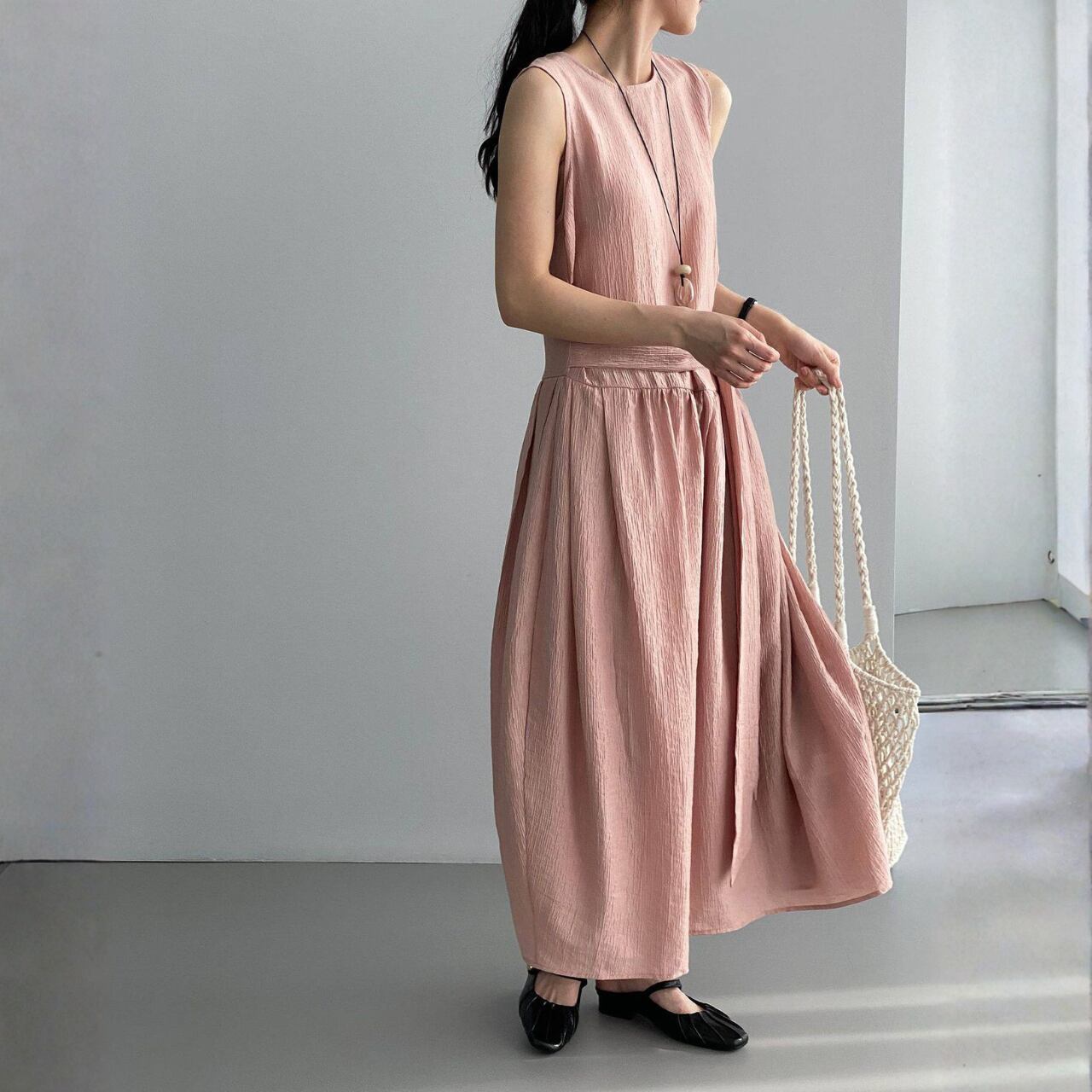 ウエストから広がるギャザーが柔らかな表情を生み出し、ロング丈のドレープが上品に揺れます。