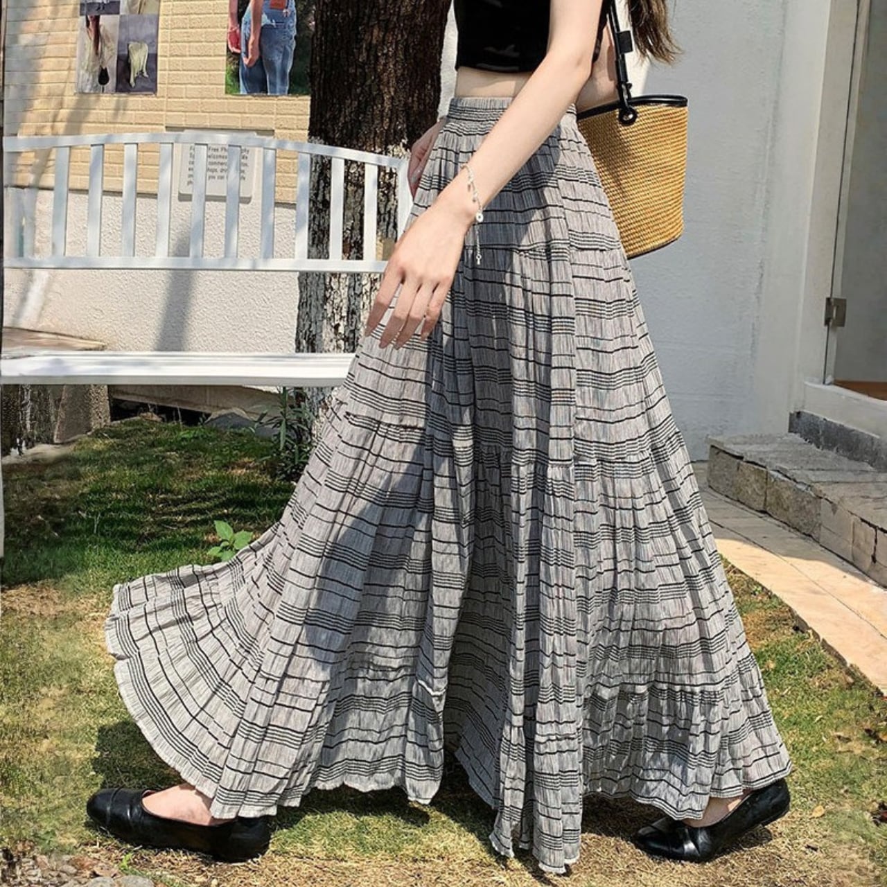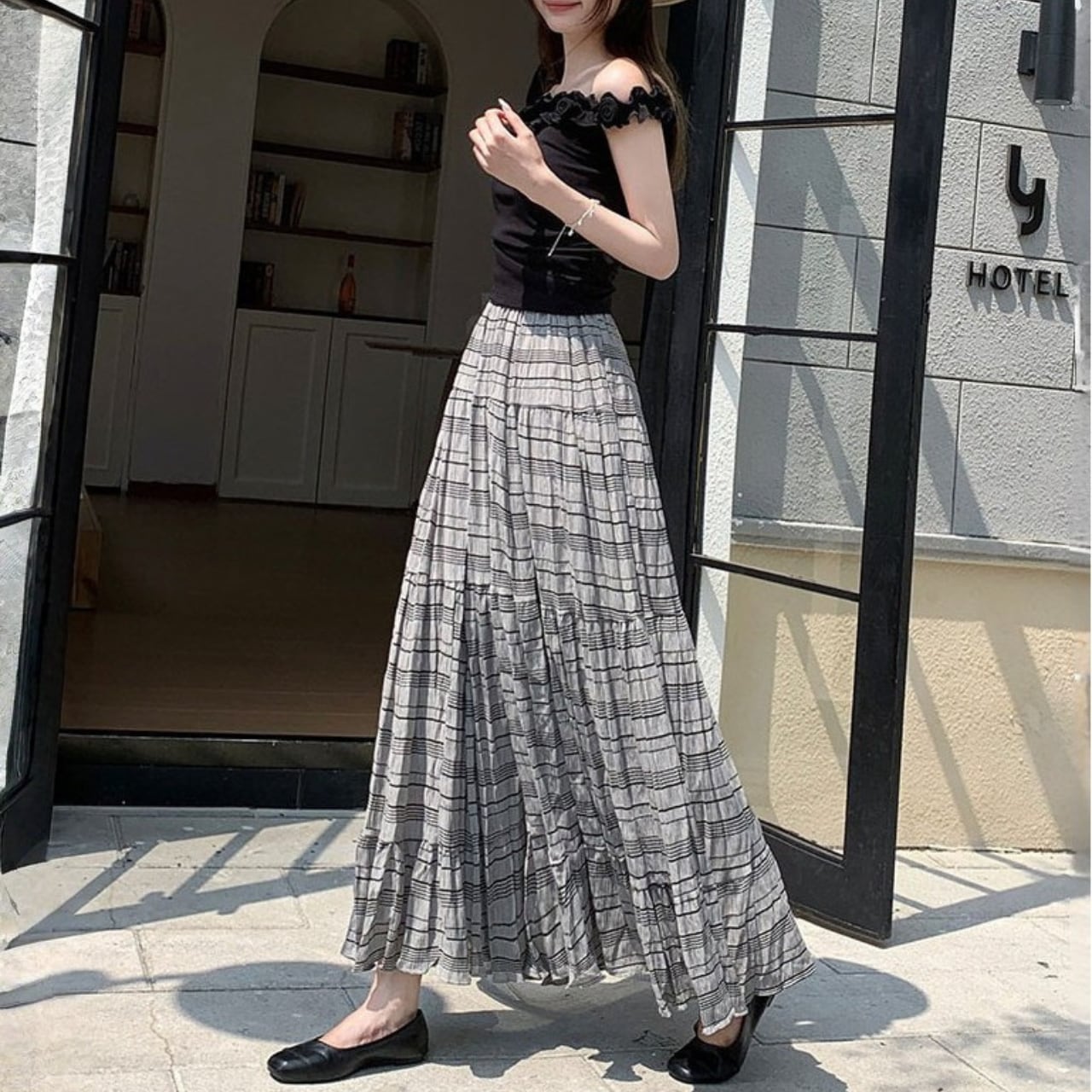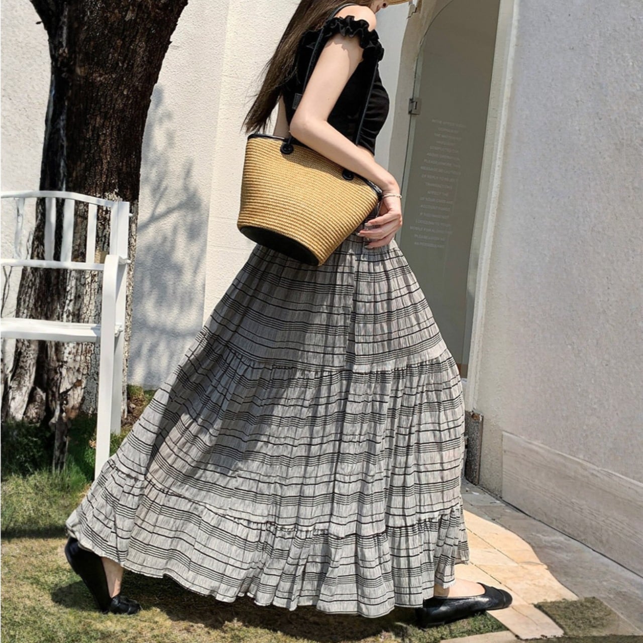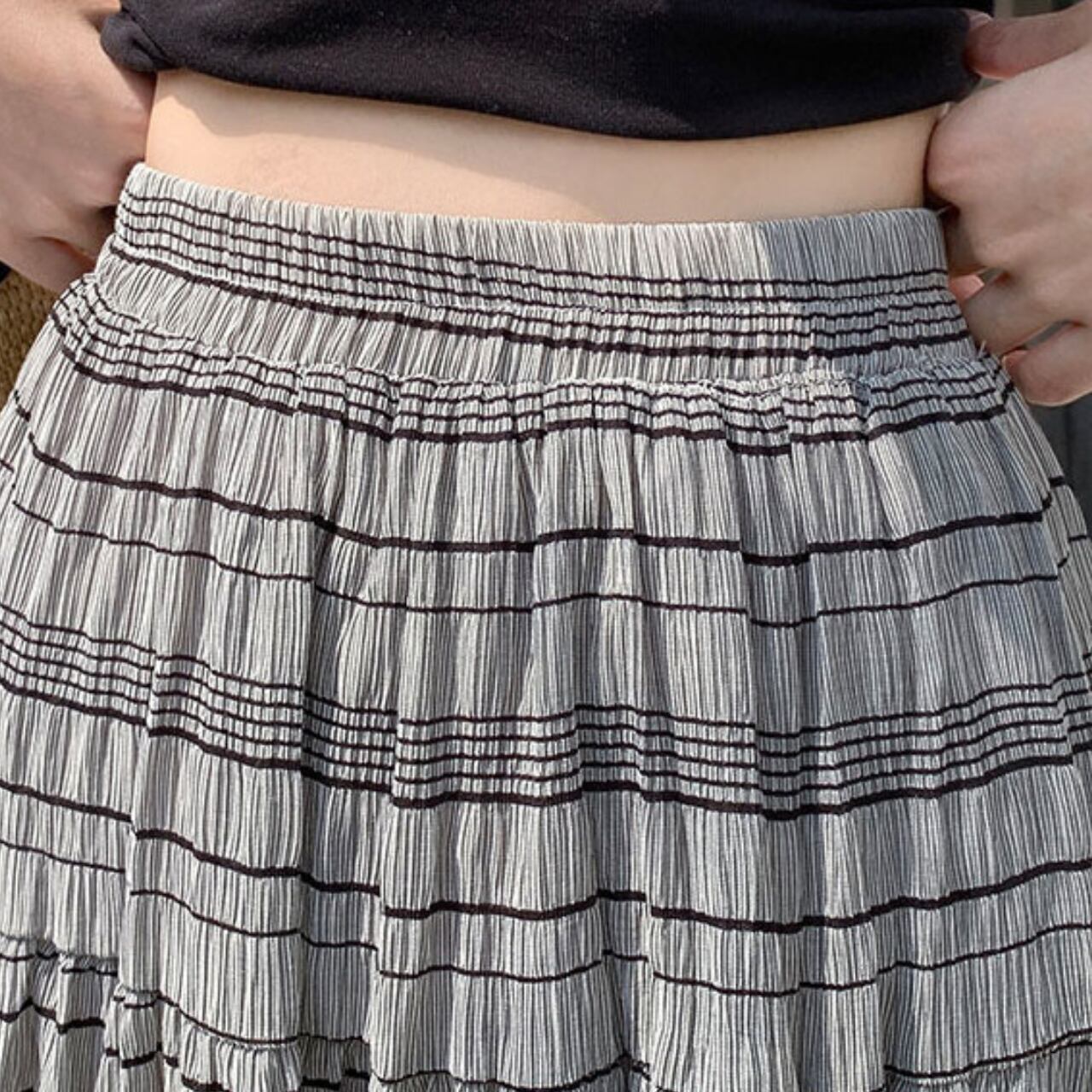デザイン性のあるティアードシルエットとボーダー柄が、コーディネートに洗練された表情を与え、リラックスしたお出かけから特別感のある日まで幅広く活躍します。